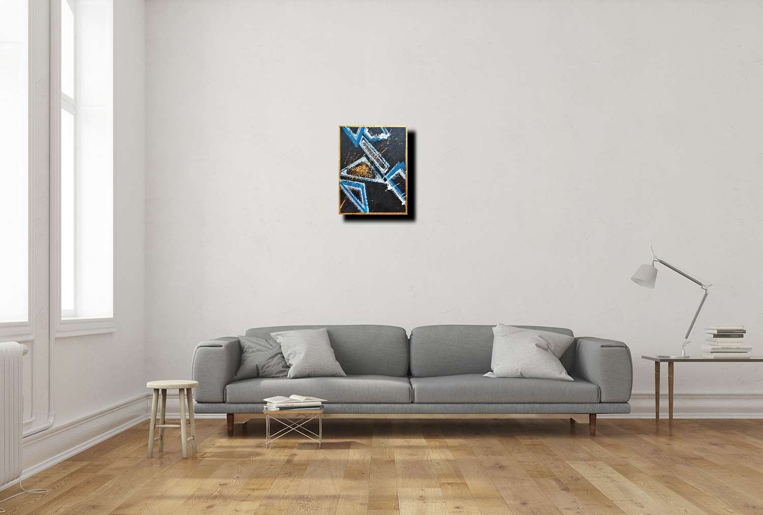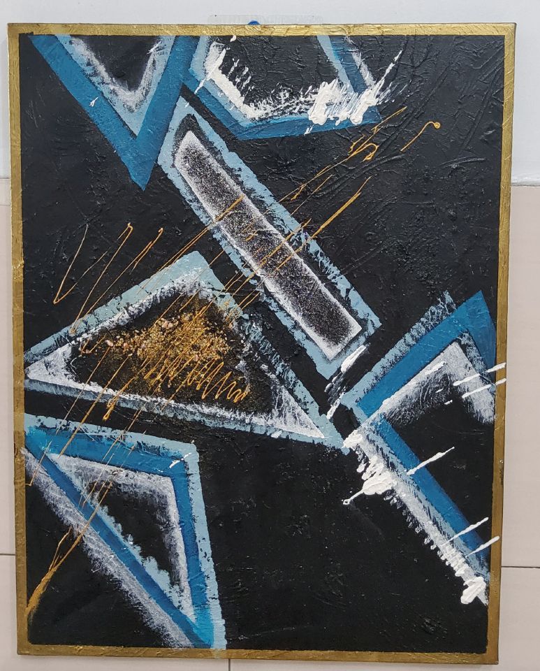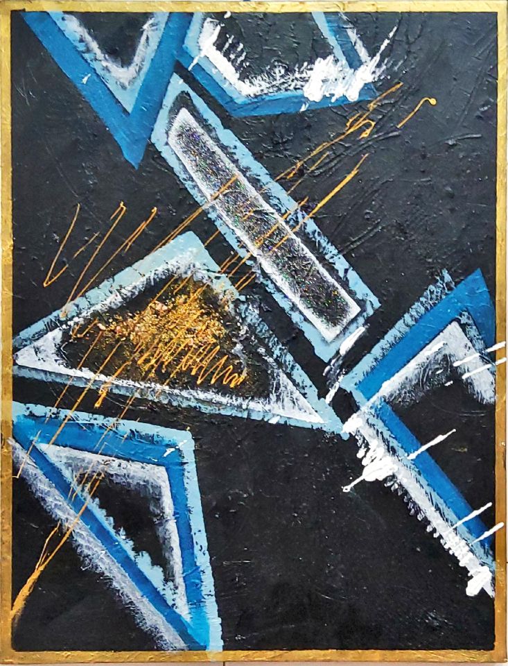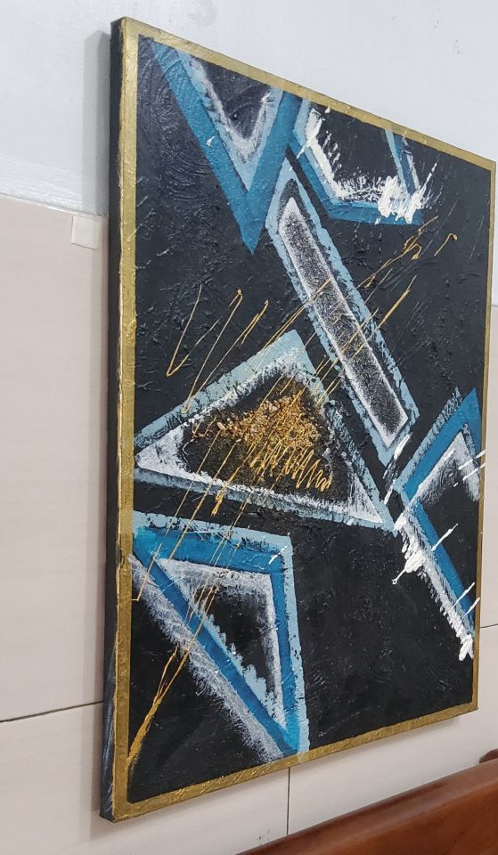 由深邃的黑色底層為舞台,營造出沈穩而神祕的氛圍。畫面中交錯這幾何形、彼此錯落、呼應、形成有秩序又略帶張力的結構感。在幾何間,金與白色的流動揮灑著,牽出節奏感。在黑的深處,光緩緩甦醒。三角的銳、五角穩、長方的靜,彼此在暗中呼吸,像無聲的星座。金色延著邊界流淌,白色的線在其中遊走,有時柔似風,有時亮如閃電,它們不說話,卻彼此懂得節奏。一粒粒的金蔥、是夜的呼吸,也是心的閃光。當光落在畫布上,那閃爍彷彿時間的碎片,在黑底裡輕輕旋轉,留下無聲的樂章。