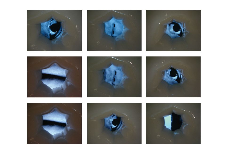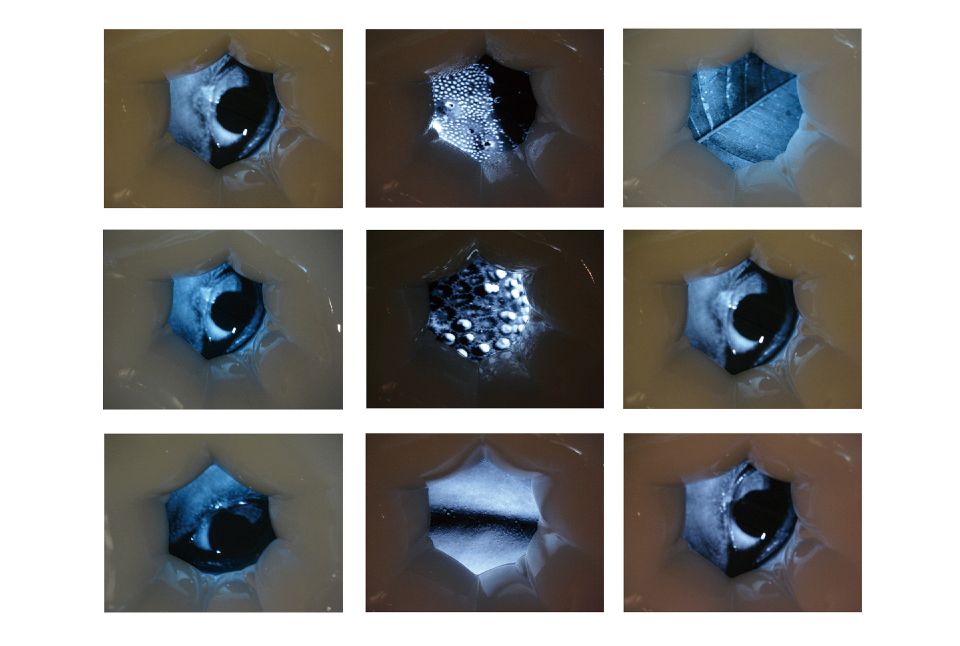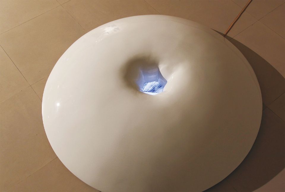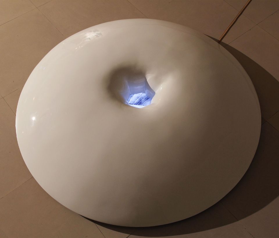 Frp光亮的肚臍為非軟性素材,它導向了當代工業、都市的胚殖環境,我們位處在高雄此地,都會與自然、人與器械是生命不能閃避的課題,作品連結著生存認同與土地認同,肚臍是一種連結著人與土地的象徵,影像內,植物、水、人體、氣泡、魚卵,形成了一種在母體內生長的隱喻,在此同時影像內人在水中吐氣,卻又暗喻著一種壓抑與無法呼吸,在安穩的表相內同時有種窒息、掙扎的感受在擴散。