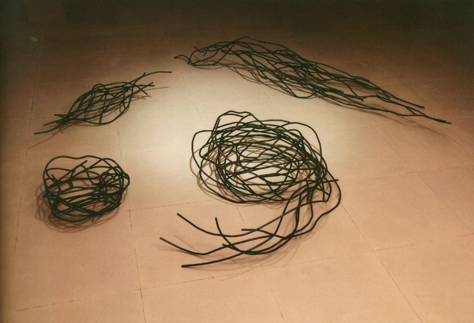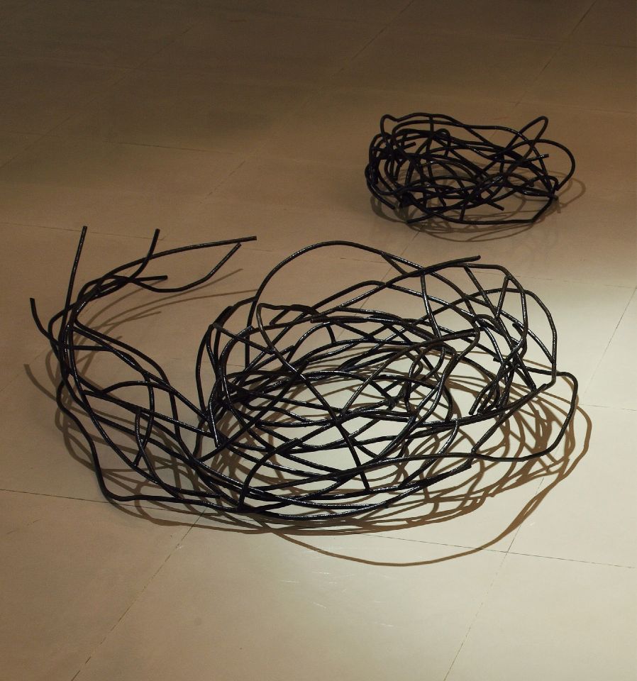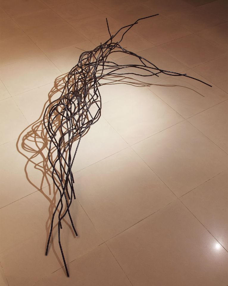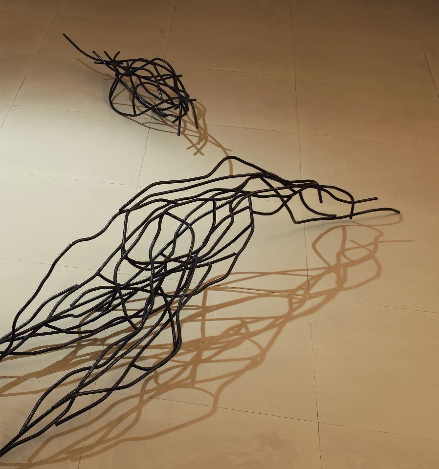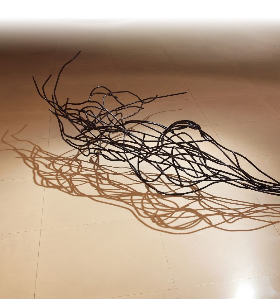 圍繞、繁複、紛雜的線性流體,以鋼條為載具,焊接出既流動又阻礙,時而規律,時而複雜的不知名物體,靜澀黝黑的線條似有若無,糾結游離在無法定位的空間向度,片段急促而殘缺。狀似掙扎,又像解脫般的橫躺在水平的地面上。