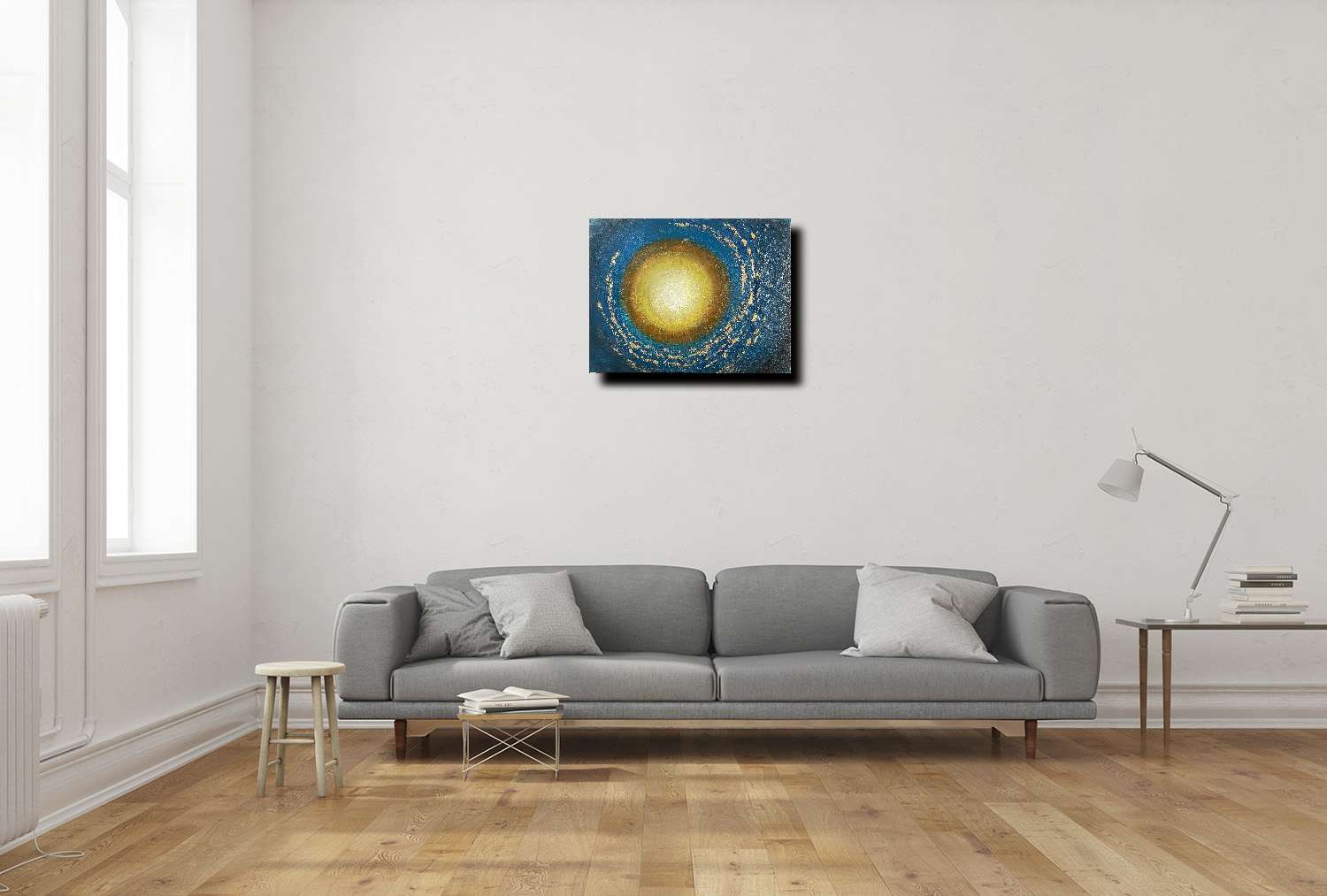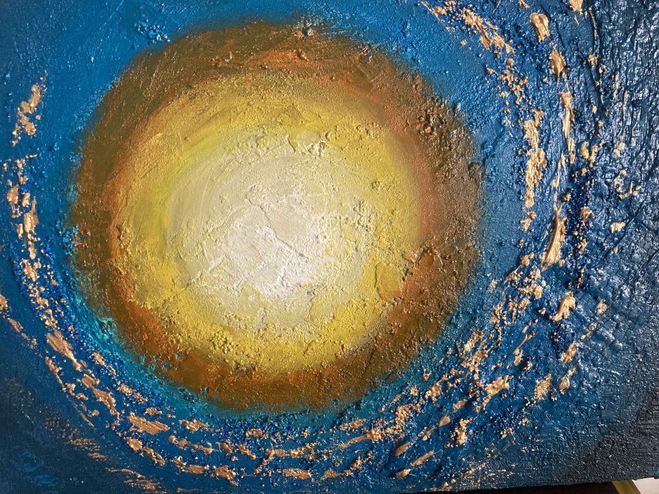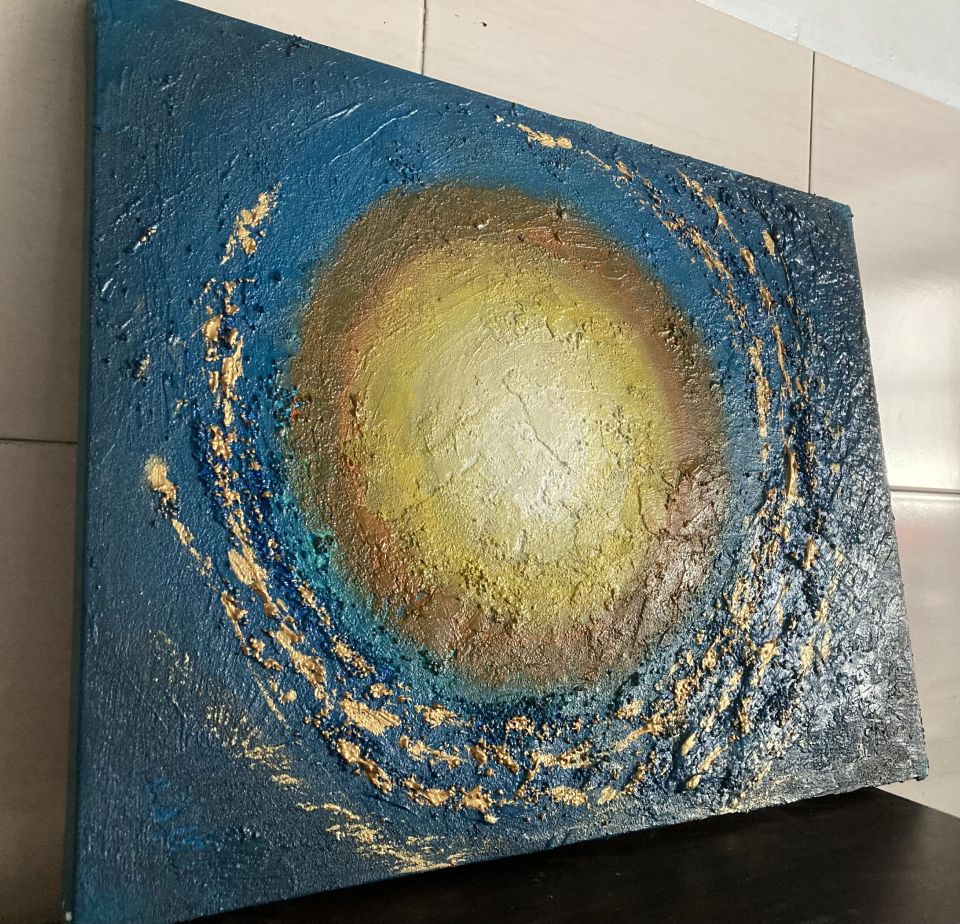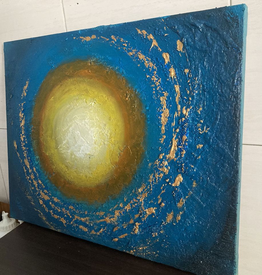 作品中黑色象徵未知與潜意識的深處。藍色層層堆疊至中央的白光,寓意意識的警覺與能量的釋放。金色為圍繞其外,形成光的結界,使整個體畫面在冷暖與明暗的對比間產生張力。透過顏料的厚塗與色層堆疊,我試圖呈現內在精神。從幽暗向光明的過度,也表現人心在柔質與超越之間的震動與平衡。