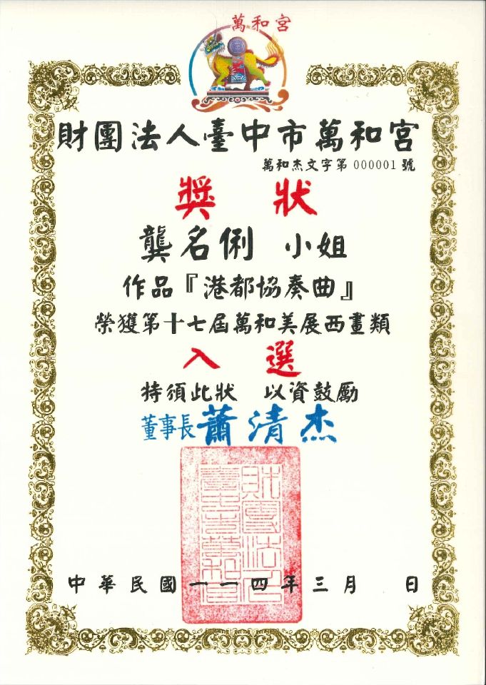 龔名俐 港都協奏曲 尺寸:116.5x91 cm 50 F 媒材:含框,油彩畫布,油畫 創作年份:2023 NT$ 200,000 我要訂購 ?藝術品購買說明 付款方式:ATM轉帳付款、信用卡線上刷卡、信用卡分期 分期數 每期金額 3期 利率0% NT$ 66,667 6期 NT$ 34,364 12期 NT$ 17,544 作品敘述 運費:NT$ 800 2024,台中市萬和宮「第17屆萬和美展」油畫,入選獎 午後的高雄港灣海風徐徐漁帆點點,雲朵在藍天翻騰浪花波濤起舞。臺灣文博會「聊療漂漂河計畫」超人氣貼圖明星的大型充氣裝置,似躍動的音符譜出如歌的行板,雄偉的海洋交響曲緩緩升起打造城市明媚的樣貌。在碧海藍天下見證潮汐 更迭十方絢爛與您翩然起舞。 Keywords:高雄港 Subject:風景 文化 城市街景 房舍建物 船 海 音樂 Style:超現實 水 天空 相關藝術品 view all 龔名俐 港都協奏曲,2023 NT$ 18,000 龔名俐 Rap兔,2022 NT$ 200,000 龔名俐 凝視,2024 NT$ 6,600 龔名俐 凱弟登月,2024 NT$ 6,600