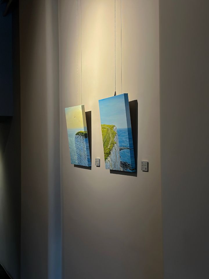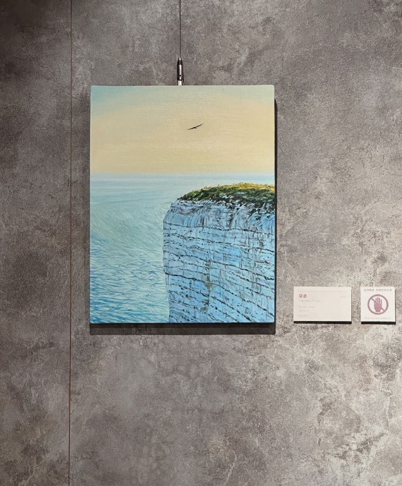 畫面中,懸崖與海洋之間存在一道視覺的斷裂,象徵情感中的縫隙與距離。而那片空曠的天空與飛行中的鳥,則讓人意識到:空間本身,也可以成為情緒的容器。整體構圖刻意簡化細節,保留大量留白與沉靜,讓觀者在這幅畫中找到屬於自己的「停留處」——也許是某段記憶未散,也許是某種思念仍然盤旋未去。