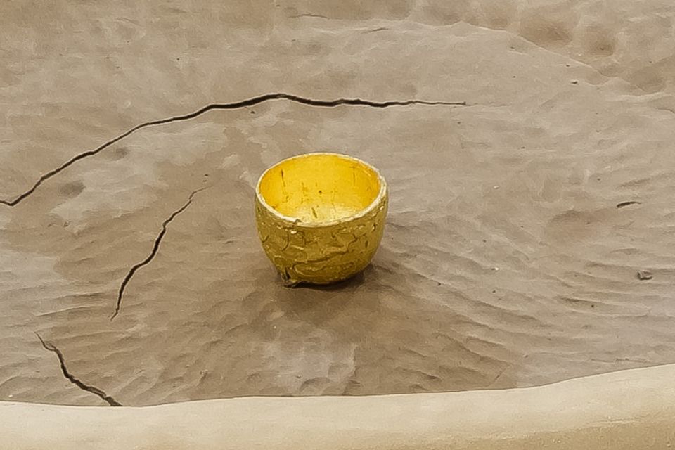 以土盤土條的方式做出一個大容器,中間則擺放著手拉坯成形的小容器,而小容器外部則用金箔包覆,用金箔的象徵意義,呈現出一種階級的差異,而容器外部則在觀看的到金杯子的地方佈滿敲碎的土塊,其中一顆土塊也以金箔包覆,展覽開始第一天,在金杯子中裝滿水,隨著時間,在微氣候的影響下,水逐漸消逝,土製的容器產生乾裂。作品以留下自身身體勞動痕跡的大容器,對比運用機器(轆轤)拉製成後包覆金箔的小容器。藉此引起思考容器的意義及水與土的之間的狀態及尺度的問題。