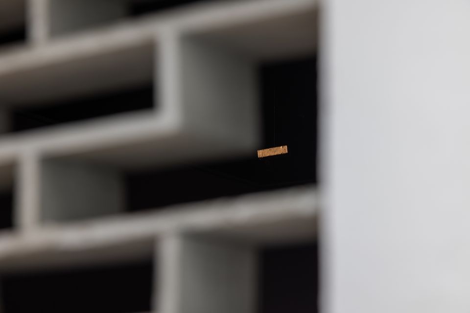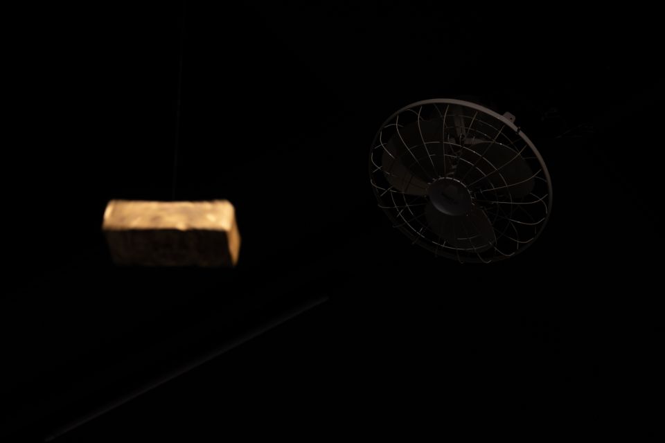 展場門口以木作以即紅磚牆只保留水泥的結構將其封住,在展場外鋪著比相對應水泥結構而形成負空間的紅磚數量再少一塊磚,而在觀看牆內展場空間時,觀者會踩/不踩在牆外紅磚上,對牆的一端彎腰/蹲低/坐著進行凝視,直面展場內部的牆上,有一個與磚塊比例相符的影子再轉動,而再望向被光投射出影子的實體時,在高處,一個貼附金箔的磚頭,任憑氣流擺動。