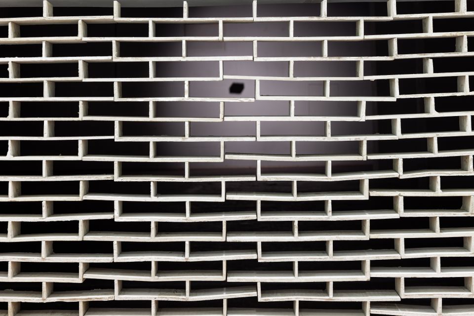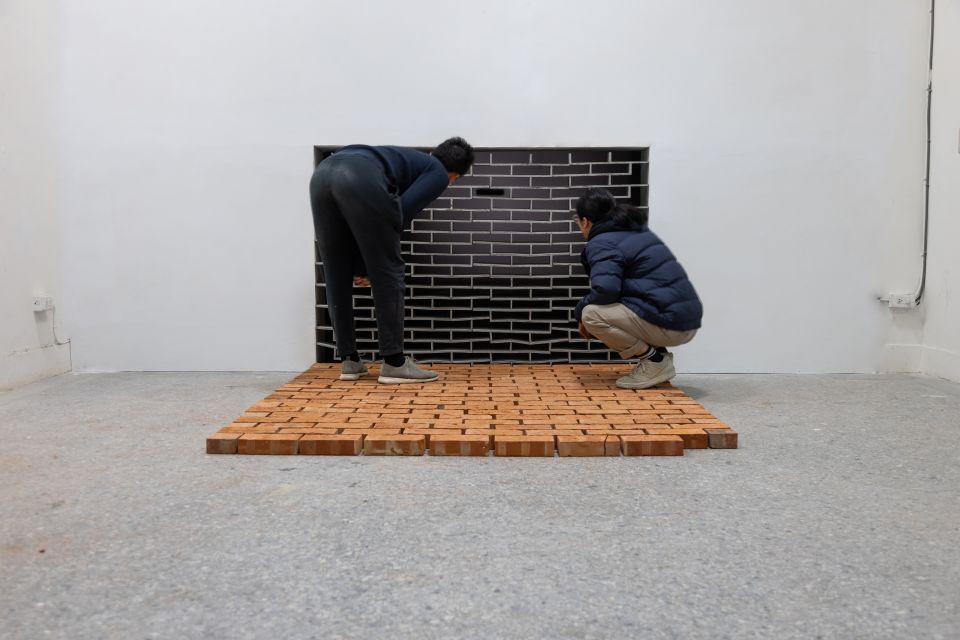 磚牆的解構,只留下水泥結構,使得磚牆的功能性轉化,堅固、阻擋的特性削弱,可視性在此被解放,然而觀者只能放低姿態凝視展場空間,身體於法進入感知。當限制觀者進入展場,只能凝視時,與進到展場觀看時的差異是甚麼?是否擺置於展場空間的物件我們才視為藝術品並對它敬仰?而展場外部的日常物件卻視之貧乏。