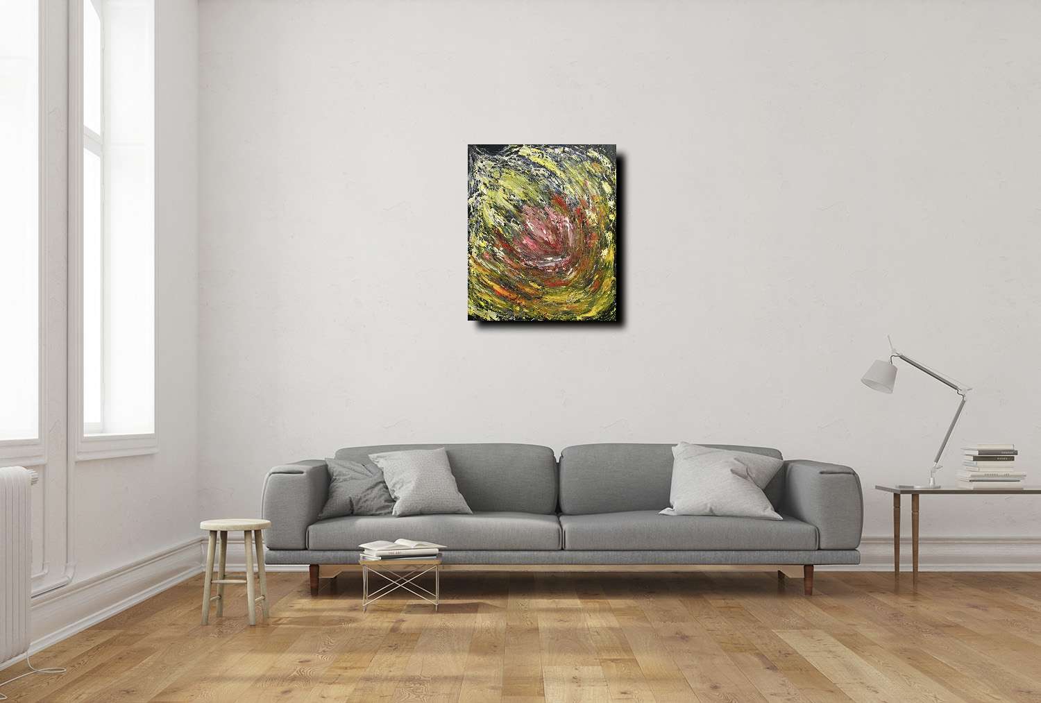 在稍微理解「空」其實是「生生不息」的「流」後,我用鮮明強烈的黃、橘、白厚疊以刮抺的方式營造出旋轉的流動感,以及最後在左上角漸漸成為雲煙無邊無際、無分別的「不生不滅、不增不減」。