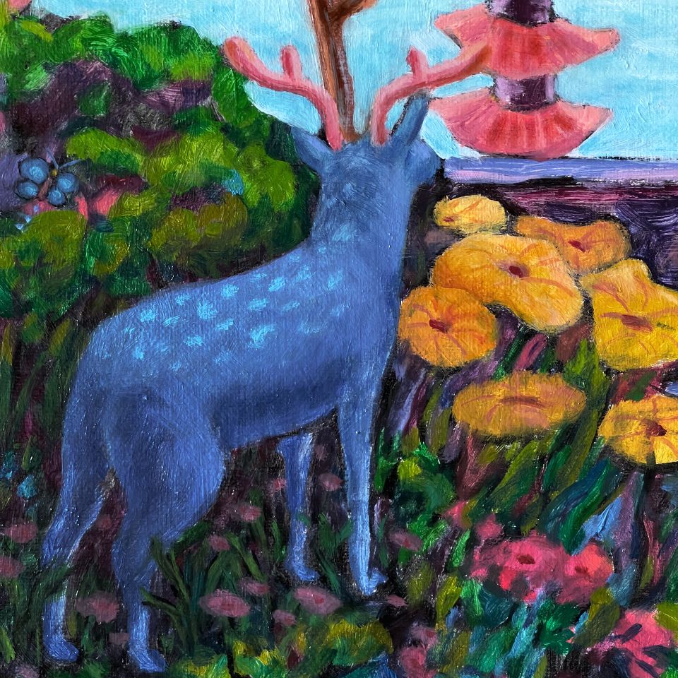 第一次從日月潭的文武廟向下俯瞰時就被這美景深深吸引,這也是從神住所的視角欣賞到的美麗畫面。畫中的梅花鹿則出自想像——神的使者一方面欣賞著美景,一方面也觀察著人類——有冀望人與萬物能和諧共存共榮之意。本作品亦算是紀錄到日月潭旅行時所發現的美景,使用較鮮明的配色,並且在造型和構圖方面皆頗富童趣及想像力,彷彿用孩子般的好奇眼光欣賞著萬事萬物。使用日本全麻畫布,更利於作品的長期保存。