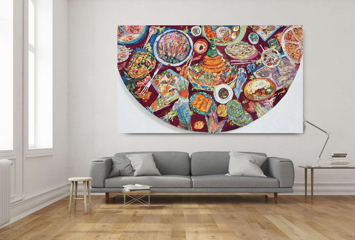 個人創作脈絡是從「剩食」來反思「人-物(廚餘、剩食)-文明社會」之間的關係,從第一件平面繪畫《排遺》來思考過度現代的社會趨勢,創作者以詭局荒誕的氛圍描繪餐桌結束的景況;杯盤狼藉的背後是剩食是對餐桌文化的一種二次審視,我們在餐桌上獲得了什麼,在餐桌上是捨棄了什麼,都意味著個人背後的意識與日常所行,而此些剩餘下的餐食,是否也意味著人類文明高度且過度膨脹的一種——「文化的排遺」。《排遺系列》,透過從廚餘-剩食的指涉,發展出具當代指涉的膠彩繪畫;而此件作品《排遺:東南亞式》,從東南亞過往的飲食經驗與餐桌飲食慣習的獨立面貌,發想出不同吃食情況後,菜系在不斷疊合形式下、視角變換下的畫面,並特意使用了具高飽和度的、具文化符碼的視覺色系,在繪製的菜系中涵蓋了東亞與東南亞文化交融後的「娘惹」系統、「台式的泰菜」等等,體現在吃食的過程與剩餘皆視見了地域間飲食模式的差異與共融。