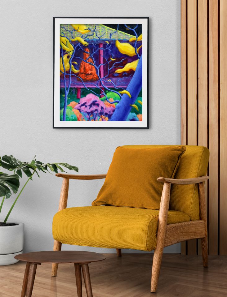 魏安杰 內境―外境 尺寸:45.5x53x2 cm 10 F 媒材:壓克力顏料,油彩,油彩畫布,油畫,畫布,複合媒材 創作年份:2026 NT$ 8,600 我要訂購 ?藝術品購買說明 付款方式:ATM轉帳付款、信用卡線上刷卡、信用卡分期 分期數 每期金額 3期 利率0% NT$ 2,867 6期 NT$ 1,478 12期 NT$ 754 作品敘述 運費:NT$ 350 本件作品使用強烈鮮明的色彩表達人內在情感和意念的各種起伏波動,畫者將原本的樹葉幻化成流動的金黃能量,藉以表現心靈內在與外在世界之間的交流互動──外境的一切皆由內在信念創造而成,這似乎就是所謂的“心想事成”。畫中端坐於屋內的菩薩寓意為眾人皆有的內在神性,靜靜地感受觀想著屋外的自然變幻。 Keywords:哲學 菩薩 東方 花草 正念 冥想 人生 當下 植物 Subject:靜物 文化 花草 房舍建物 樹 Style:野獸派 超現實 具象 表現主義 象徵 裝飾 觀念 葉子 日本 相關藝術品 view all 魏安杰 神望日月潭,2024 NT$ 9,500 魏安杰 My Blue Monday,2022 NT$ 11,000 魏安杰 初鹿幻境,2025 NT$ 8,800 魏安杰 人造風景,2025 NT$ 11,000