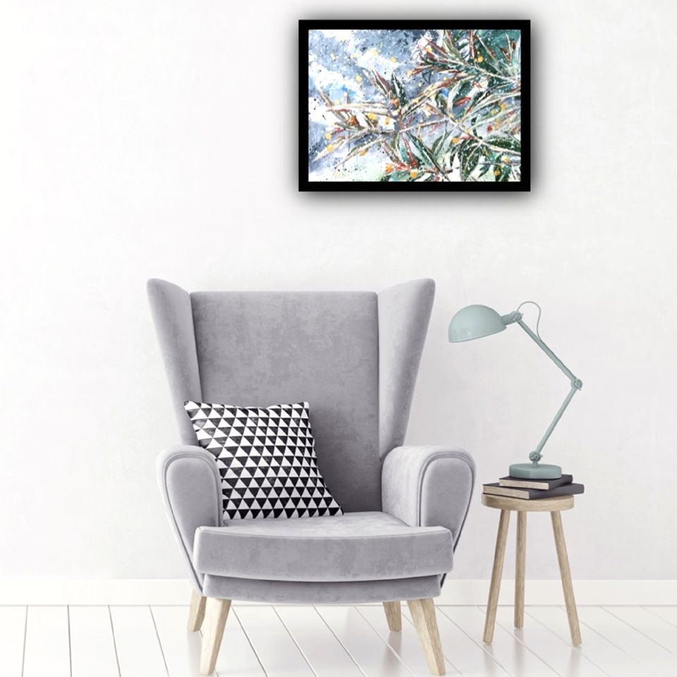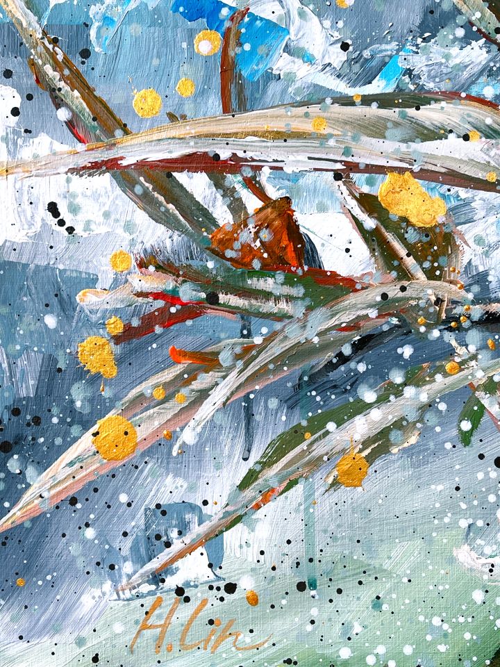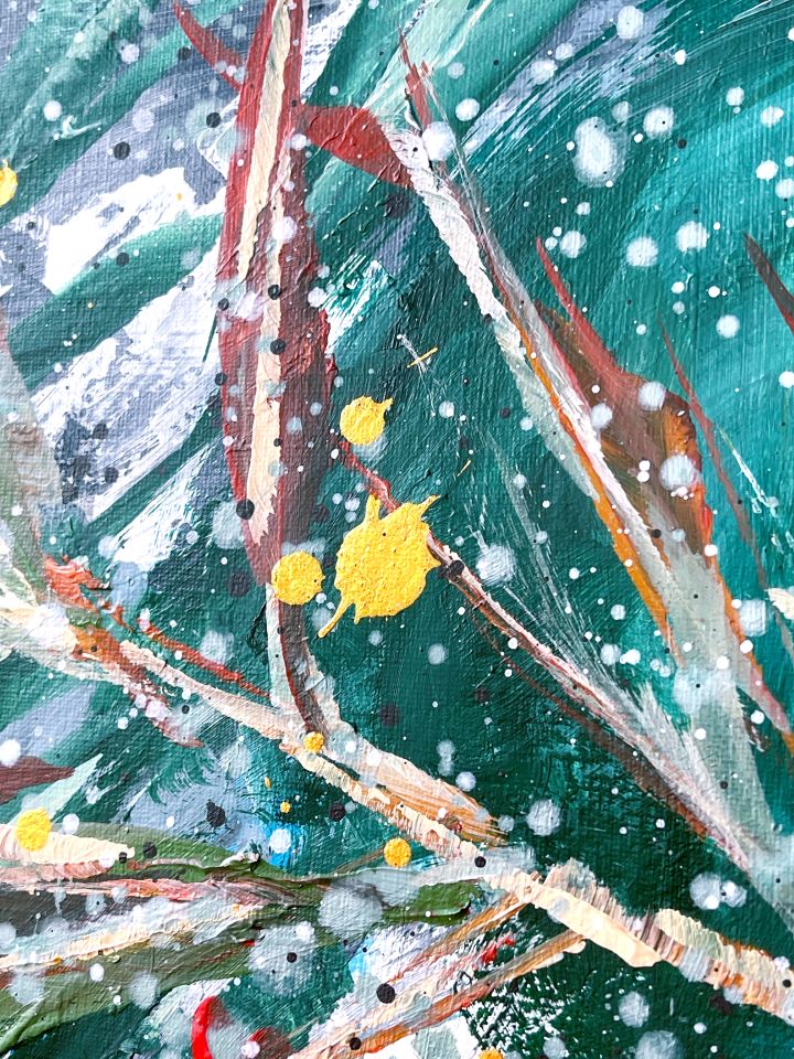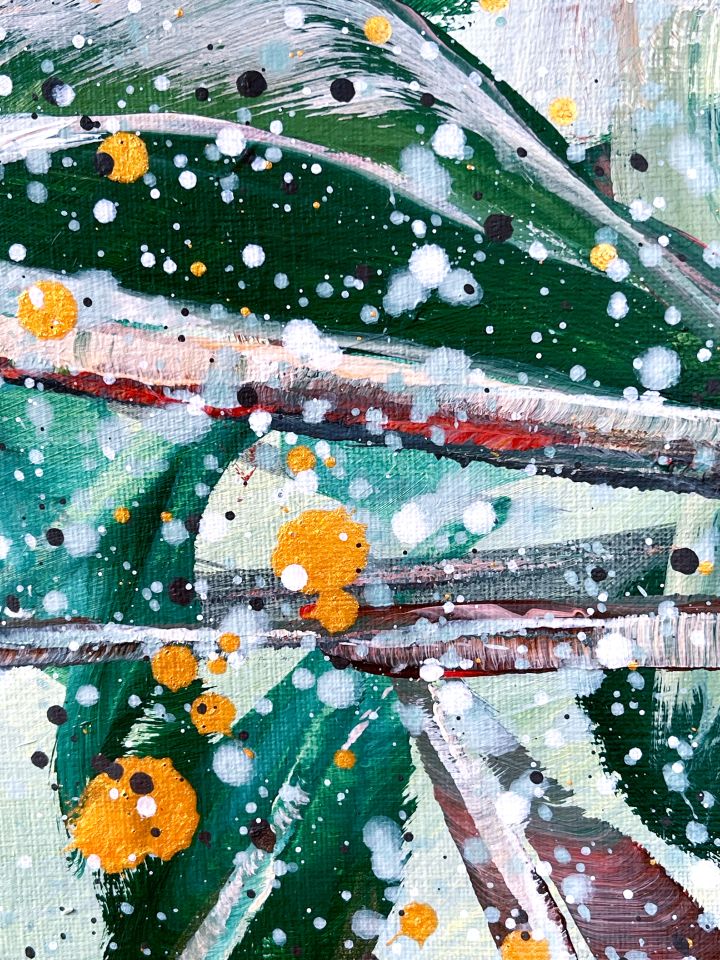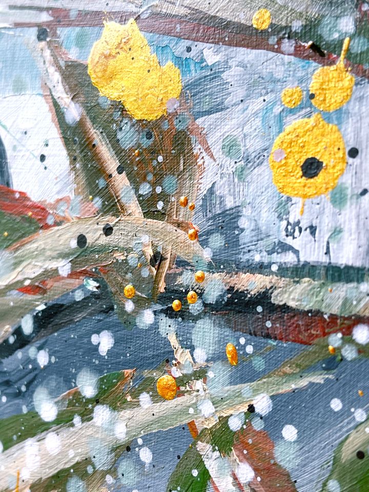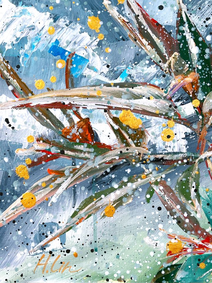 為了紀錄四季變遷,我每年有畫下周圍環境第一支花的習慣. 這幅原畫靈感來自於我畫室附近的尤加利樹. 每日進畫室前,去附近森林走一趟是我的習慣. 無論晴雨,沉澱心情,接受自然光與感受當季的色彩變換.