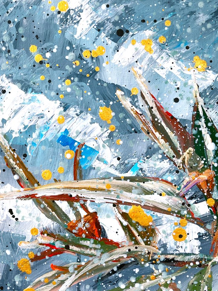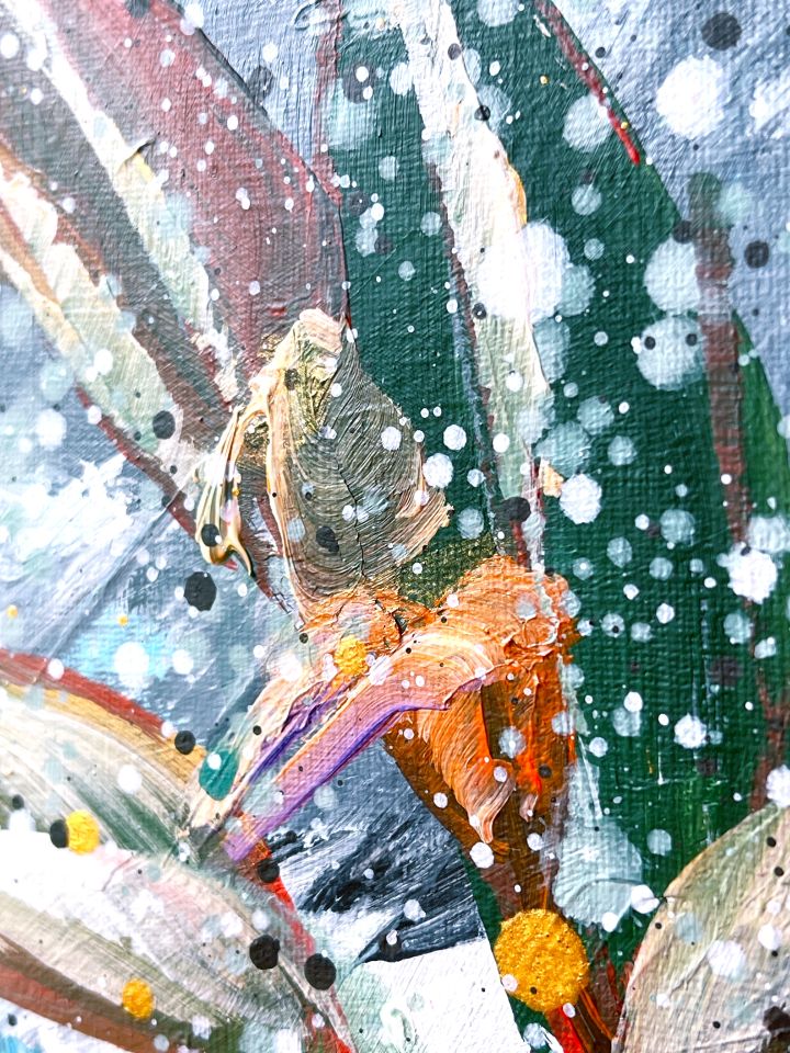 潑濺與葉尖部分使用metallic gold 金色顏料畫龍點睛. 原畫在不同角度光照下可見閃耀的金色光澤,細節非常美,原畫值得細細品味.