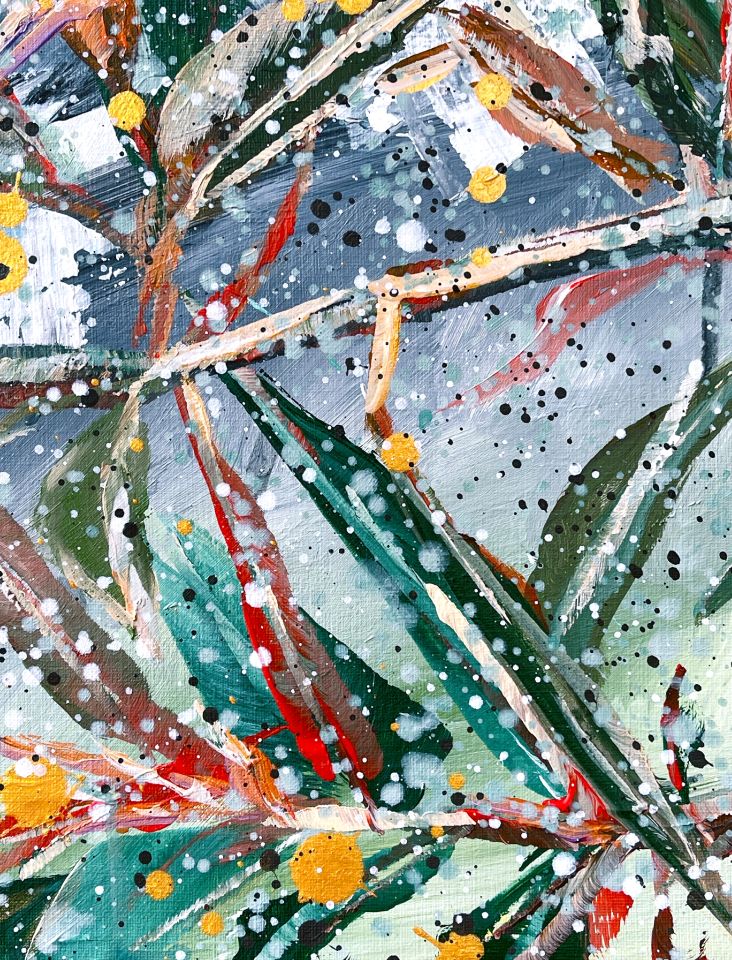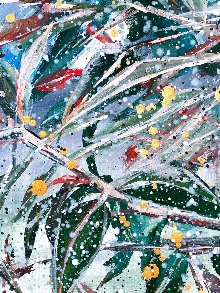 There is one particular orange gum tree that I walk past every day. It’s the flowering season of the orange gum tree; on this day, I was obsessed with the delightful view of the sunlight reflected on those new growth leaves. It has become a routine of mine to paint the first bloom of the plant around my surroundings. Now, you are looking at my latest interpretation of my favourite gum tree.