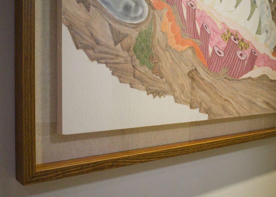 一截局部長著針葉團塊的樹幹彷彿被「開腸剖肚」,露出了類似動物器官組織的部位,流出而凝固一團半透明類似樹脂或囊袋的球形體,揭示了「偽裝」的性質。