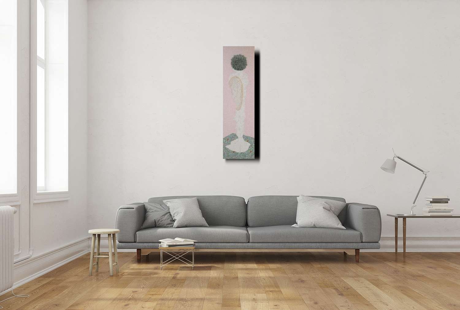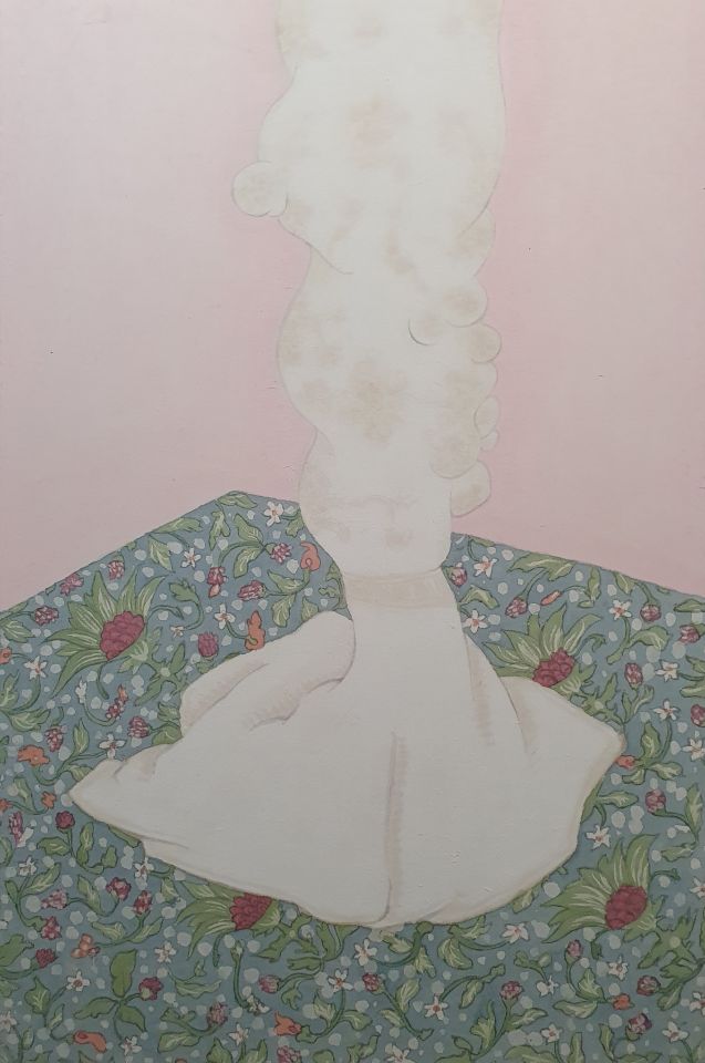 優雅端莊的擺設和外表,花瓶表面略帶肉體組織起伏的紋路,瓶身內含了甚麼我看不到,綠色團塊植物悄悄蔓延到了肖像的脖子,是甚麼讓你腦袋長了草?