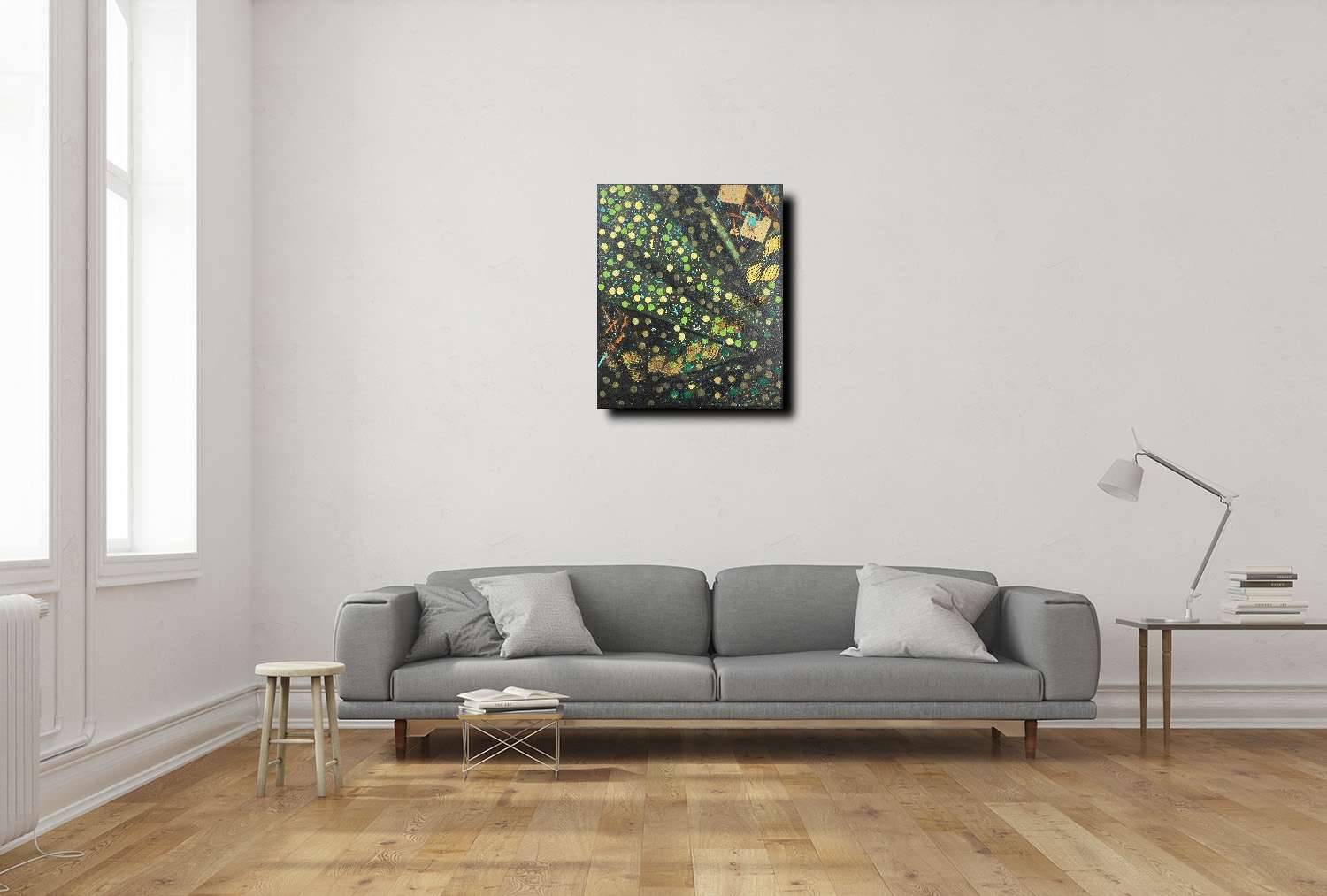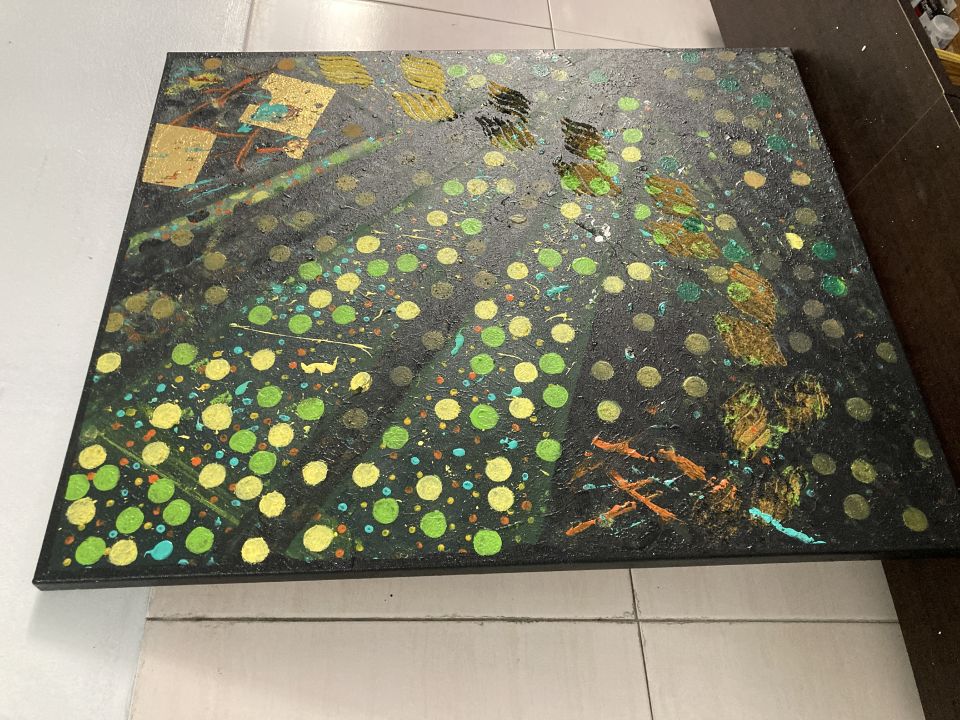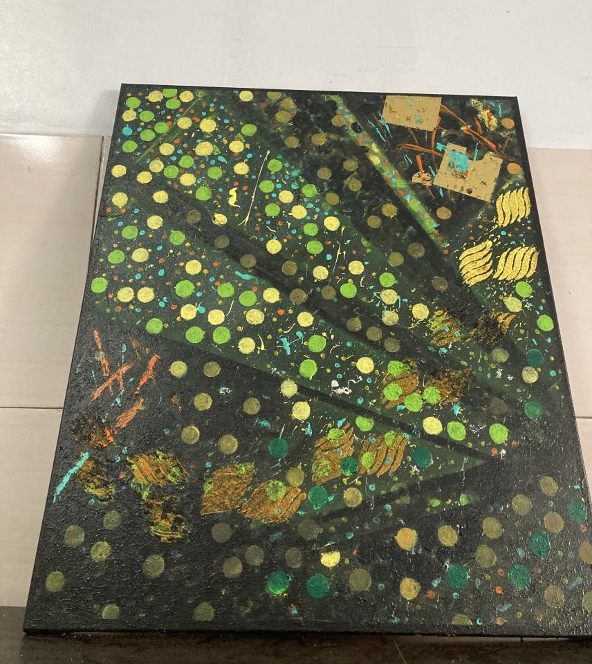 綠色與黃色在畫面中反覆出現,形成持續生成的節奏;金箔的介入則成為片段性的亮點,象徵流動中被感知卻難以停留的瞬間。