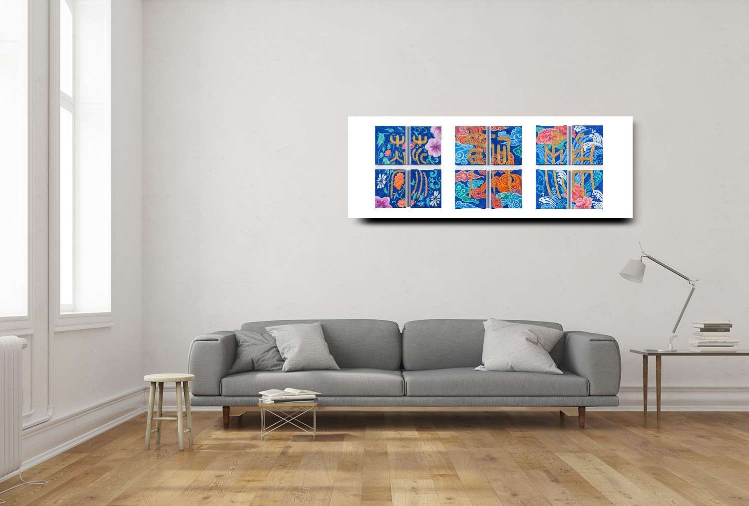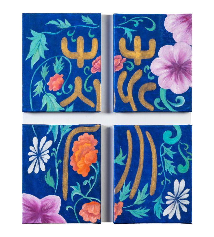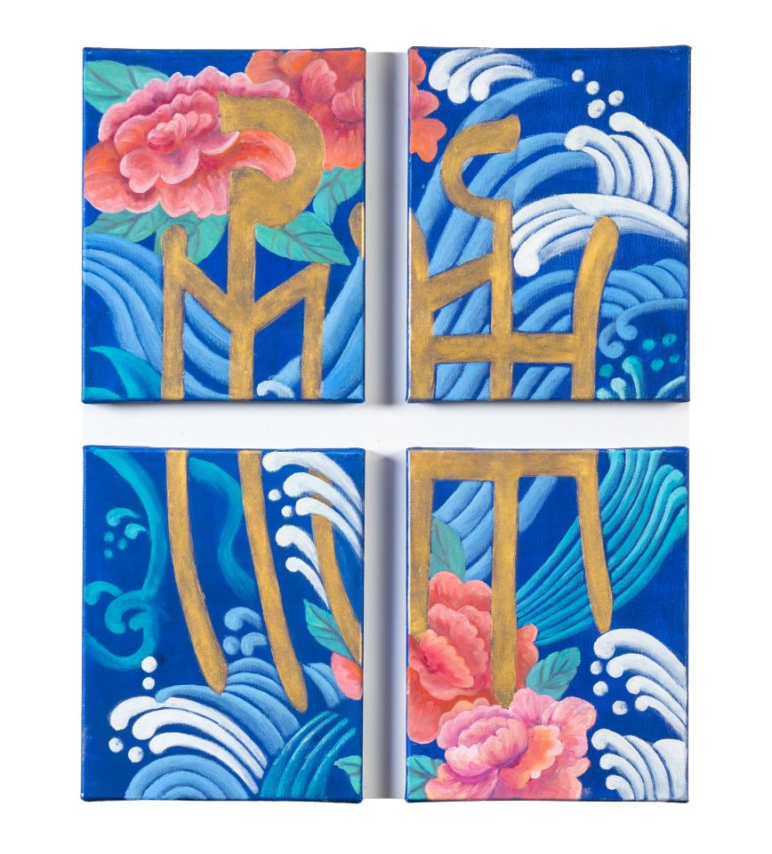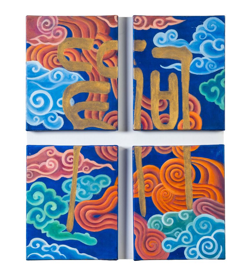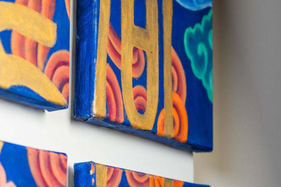 作品透過篆書、楷書、行書與英文,搭配不同背景圖騰,使文字從書寫符號轉化為承載情緒與時間感的視覺語言。