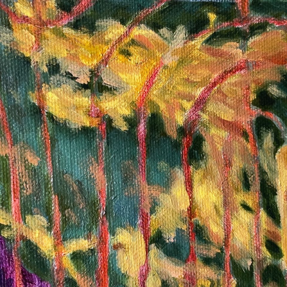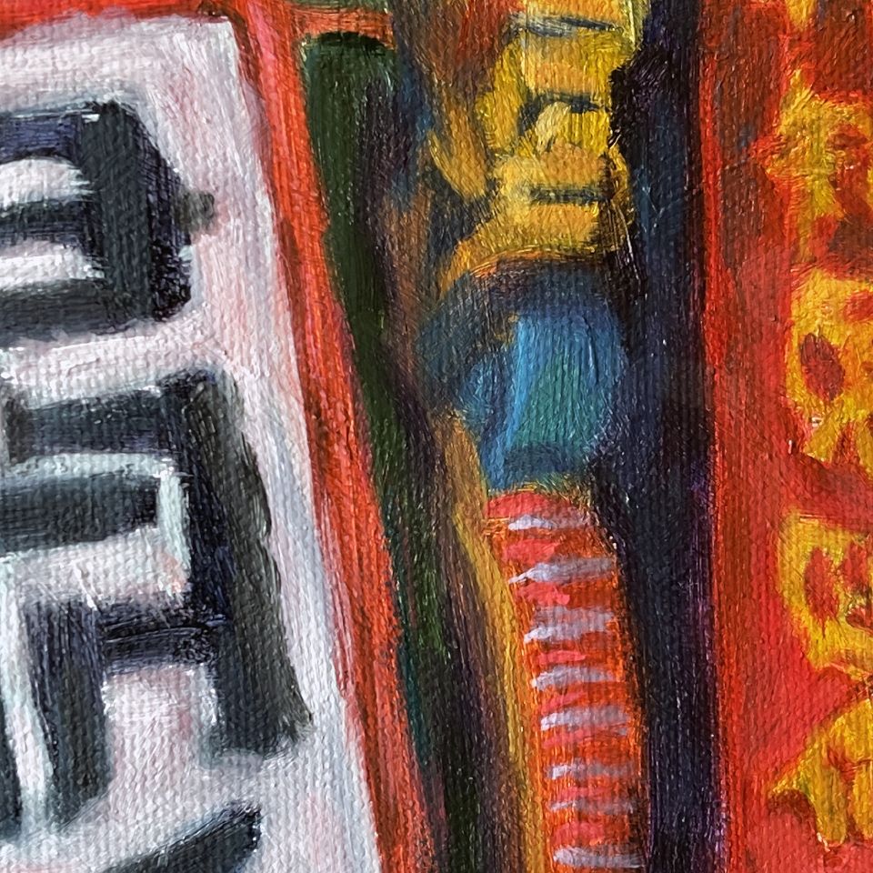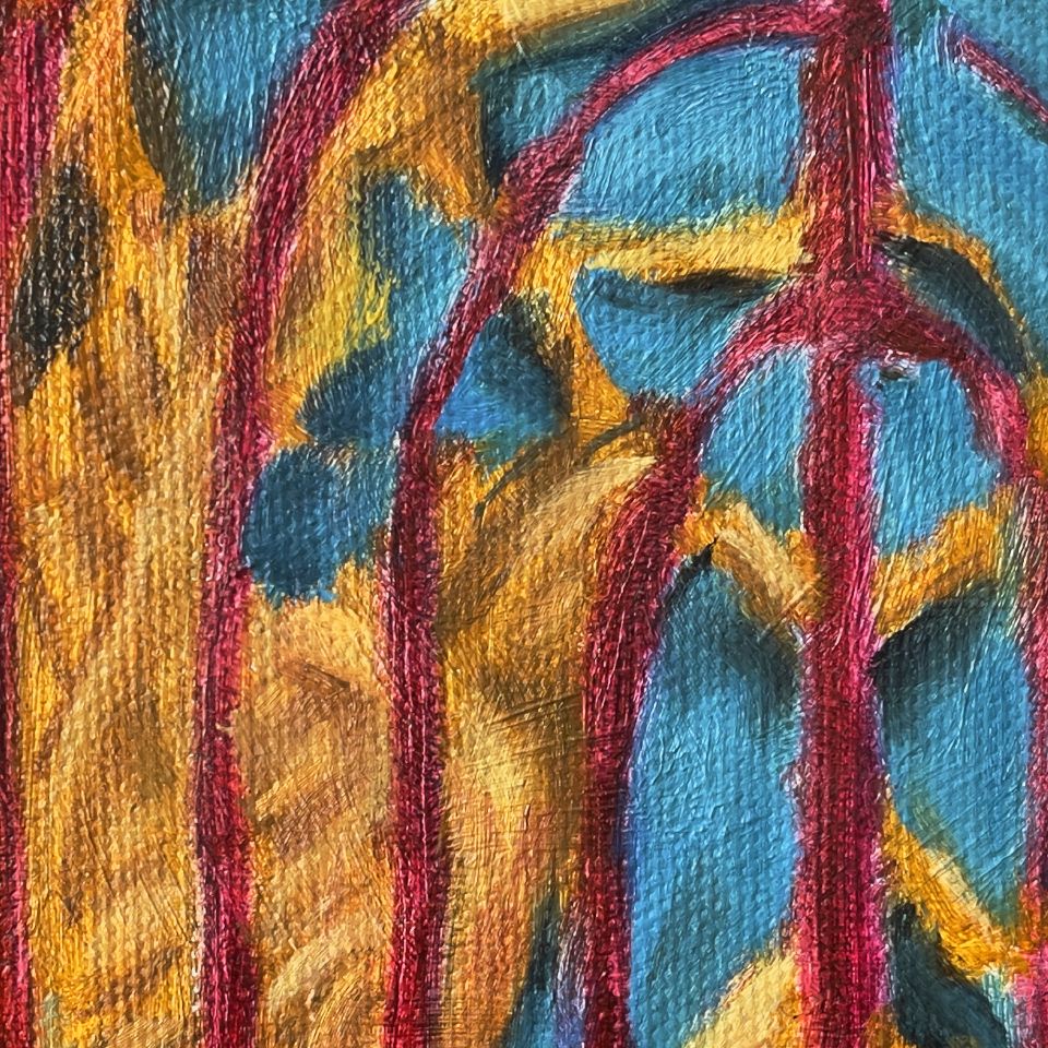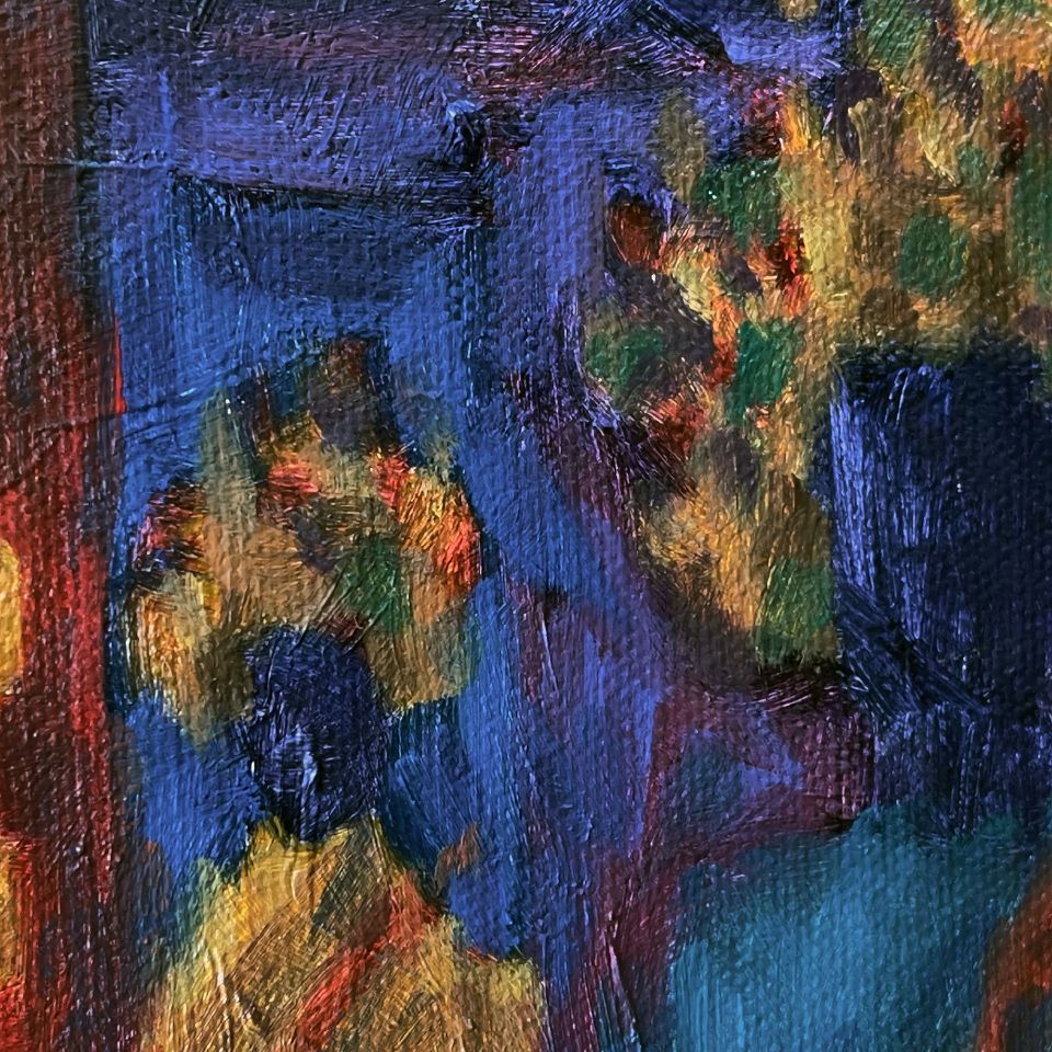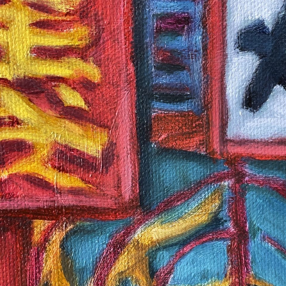 城隍廟殿門口矗立著的四個大立牌十分醒目,其中的“迴避”、“肅靜”特別吸引我的注意(畫家刻意將“肅靜”微微向左傾斜,使畫面更具動態感),再搭配牆面上的一對金色龍鳳浮雕,更充分展現城隍爺的神威氣勢,然而我也注意到左方柱子上的門牌和電錶,頗有凡間人味,與廟宇氣質產生有趣的對比,像是一種隱喻——城隍爺對凡間眾生的看顧庇佑。右方殿裡的七爺神像令人見了不禁心生畏懼,祂面朝門口似乎提醒眾生,人生在世應多行善積德,以求來世更加美好。