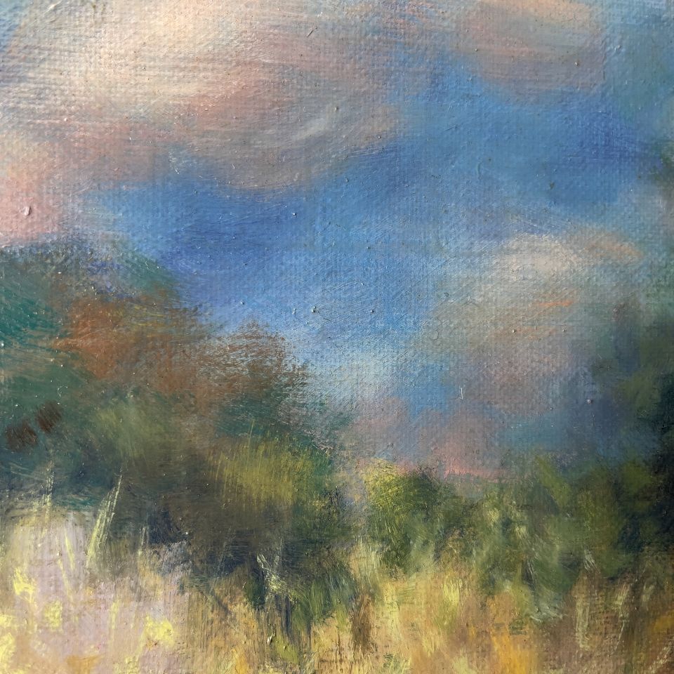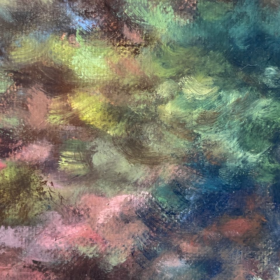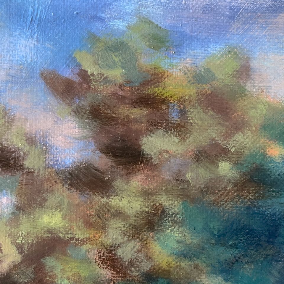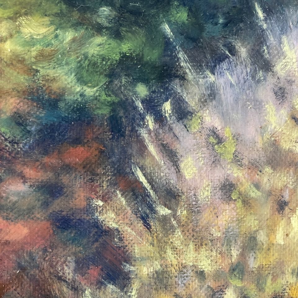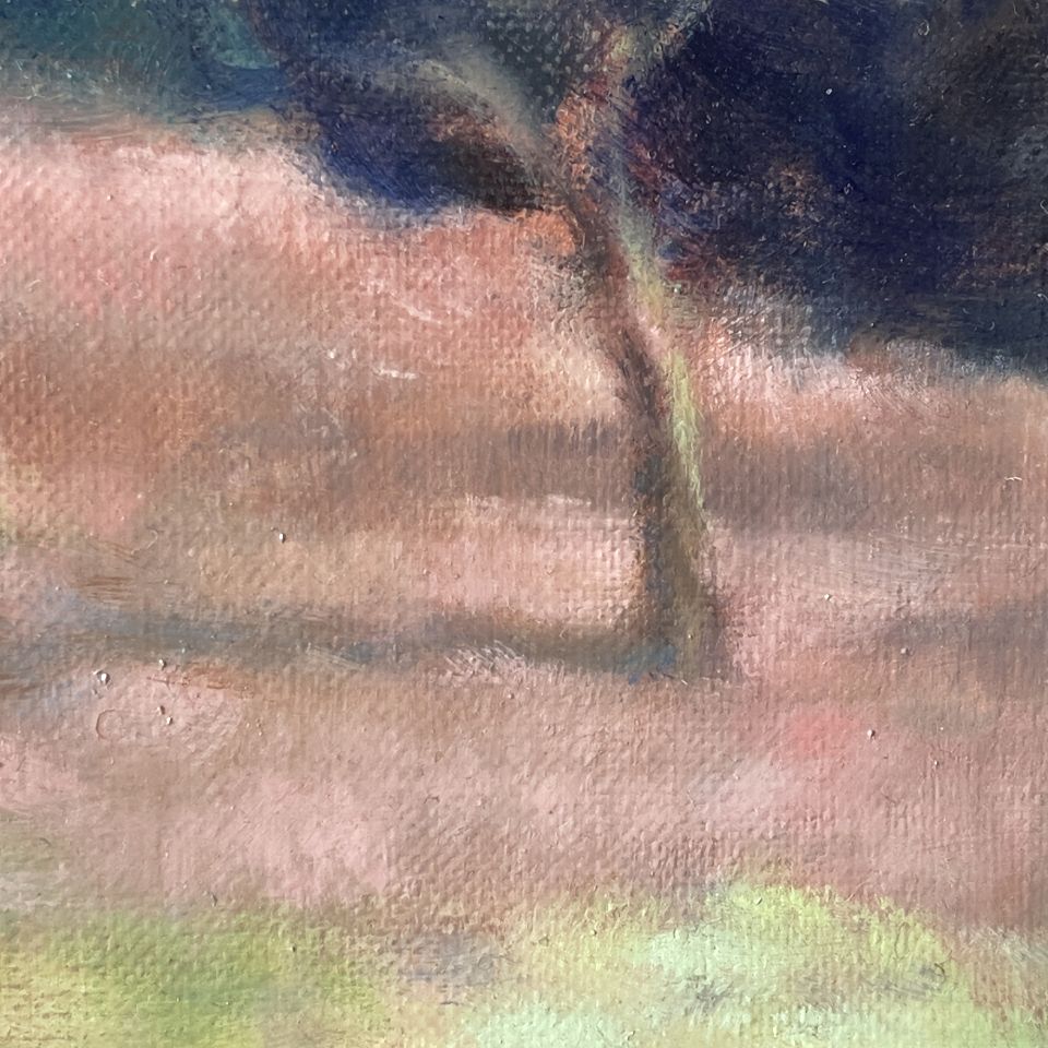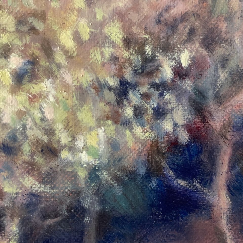 新宿御苑也是東京賞櫻名所之一,只不過造訪的時間點是秋冬之際,因此無緣見到櫻花滿開的盛況。儘管秋櫻只有葉子,但枝幹的姿態卻充滿力道,頗似蒼勁的書法,在陽光的照射之下更顯得活力滿滿。在這幅畫中,畫家採用印象派筆法表現姿態各異的櫻花樹——葉叢在晴冷的空氣中閃爍著日光光芒,呈現出一種養精蓄銳、蓄勢待發的生命力,預備以滿開之姿,迎接明年春神的到來。