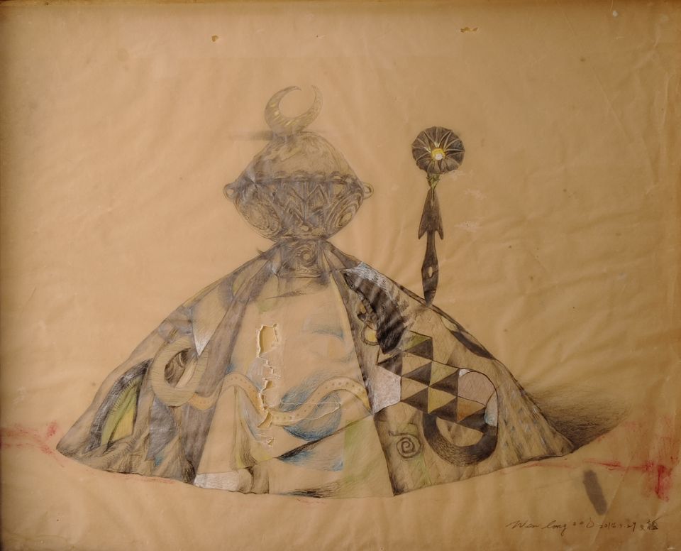 《裙與甕的複數基因》這件作品,嘗試將兩種文明符號融合。讓甕轉化為身體的核心結構,讓裙成為文化的保護層。畫面中破裂與拼貼的紋理,並非毀損,而是時間留下的歷史斷層與修復痕跡,象徵文化在世代傳承中的再生與轉譯。