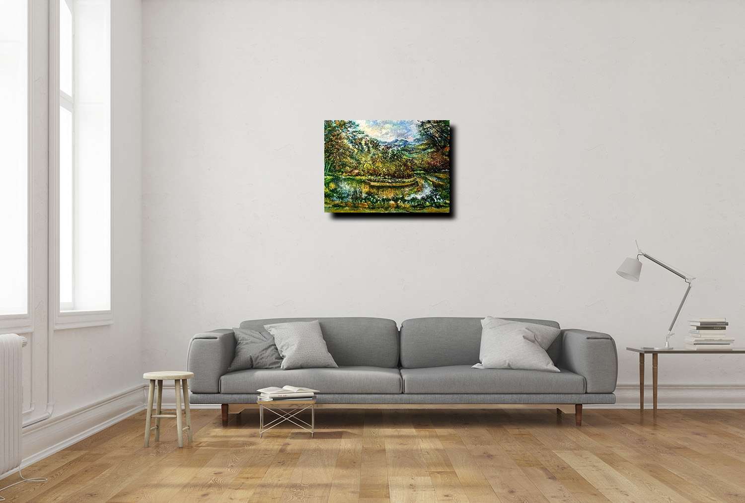 這幅藝術作品是一幅充滿自然景色的美麗畫作,作者以豐富的色彩和細膩的筆觸捕捉了風景的和諧與美感。畫布上呈現的是一個湖泊周圍被綠樹環繞的場景,畫中的顏色鮮艷且相互交織,給人一種生機勃勃的感覺。