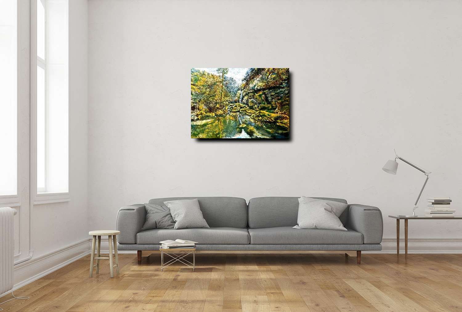 **構圖**方面,畫作採用了中心對稱的布局,河流猶如一條引導視線的軸線,從前景延伸到畫面的深處。畫面中的樹木和河流形成了一種自然的框架,引導觀者的目光不斷探索景物的層次。左邊的樹木和右邊的岩石互相平衡,增強了畫面的穩定性。