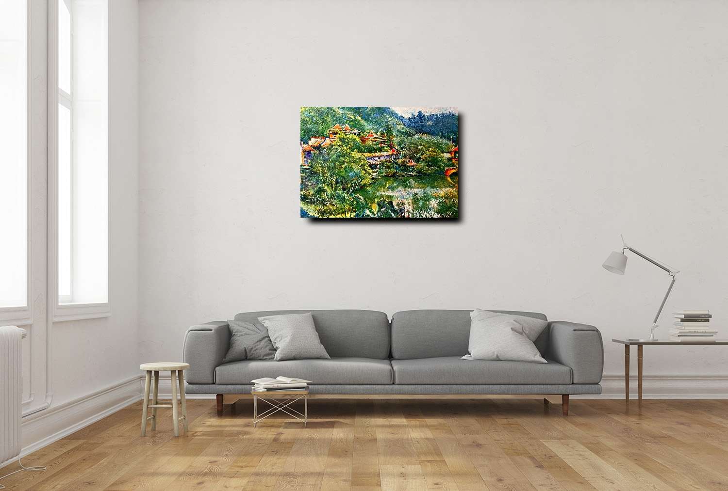 這幅油畫顯示出色的技術和藝術性,讓人印象深刻。從組成上來看,畫家成功地運用了多層次的結構來呈現景深,將周圍的自然景觀與傳統建築結合得恰到好處。建築群落的布局巧妙地與周遭的樹木和山丘相互映襯,形成和諧的整體。
