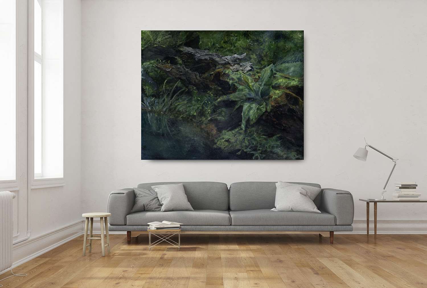 畫面透過層層疊加的綠色與冷暖色調,營造出潮濕森林的空氣感與深度。柔軟而流動的筆觸試圖捕捉光線在葉片、水氣與苔蘚之間的變化,使觀者彷彿置身於靜謐而充滿生命力的環境之中。