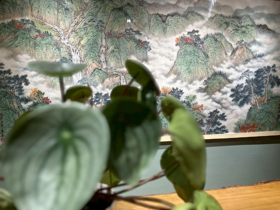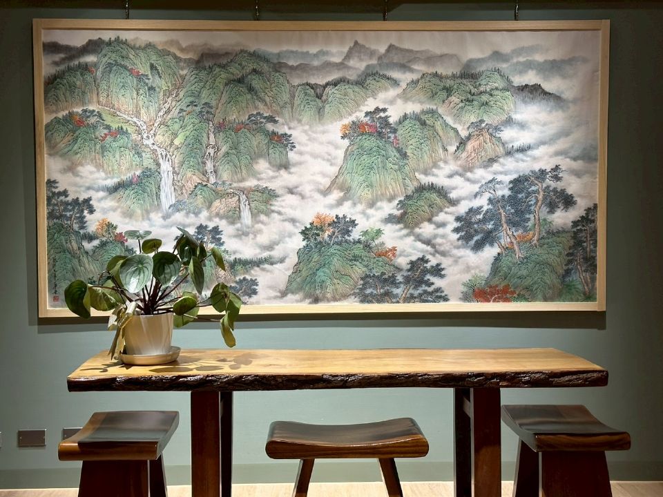 畫面巧妙運用墨色的層次與彩墨暈染營造出翻騰不息的「雲海」,將堅硬的山石與柔動的水霧達成和諧共生,賦予了畫面一種虛實相生的「呼吸感」。這種結合了雲南的高原氣息與島嶼台灣的氤氲水氣,轉化為具有全球視覺張力的當代彩墨語言,成為寫實範疇下的「心靈寄託」。