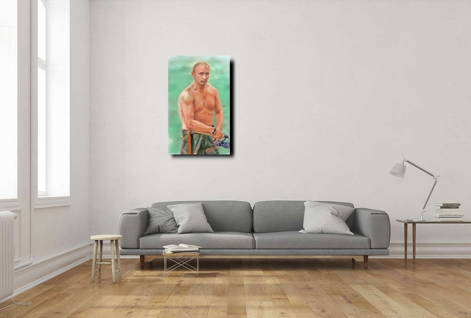 〈俄羅斯總統 普丁畫像〉這幅畫作展現了一位強悍且充滿決心的領袖形象,他赤裸上身,露出結實的肌肉,象徵著無畏的精神與強大的體魄。他的目光銳利而沉著,散發出堅定不移的意志與領袖風範。胸前的十字架吊墜,代表著信仰與內心的信念,而手中的望遠鏡則暗示著遠見與掌控全局的能力。