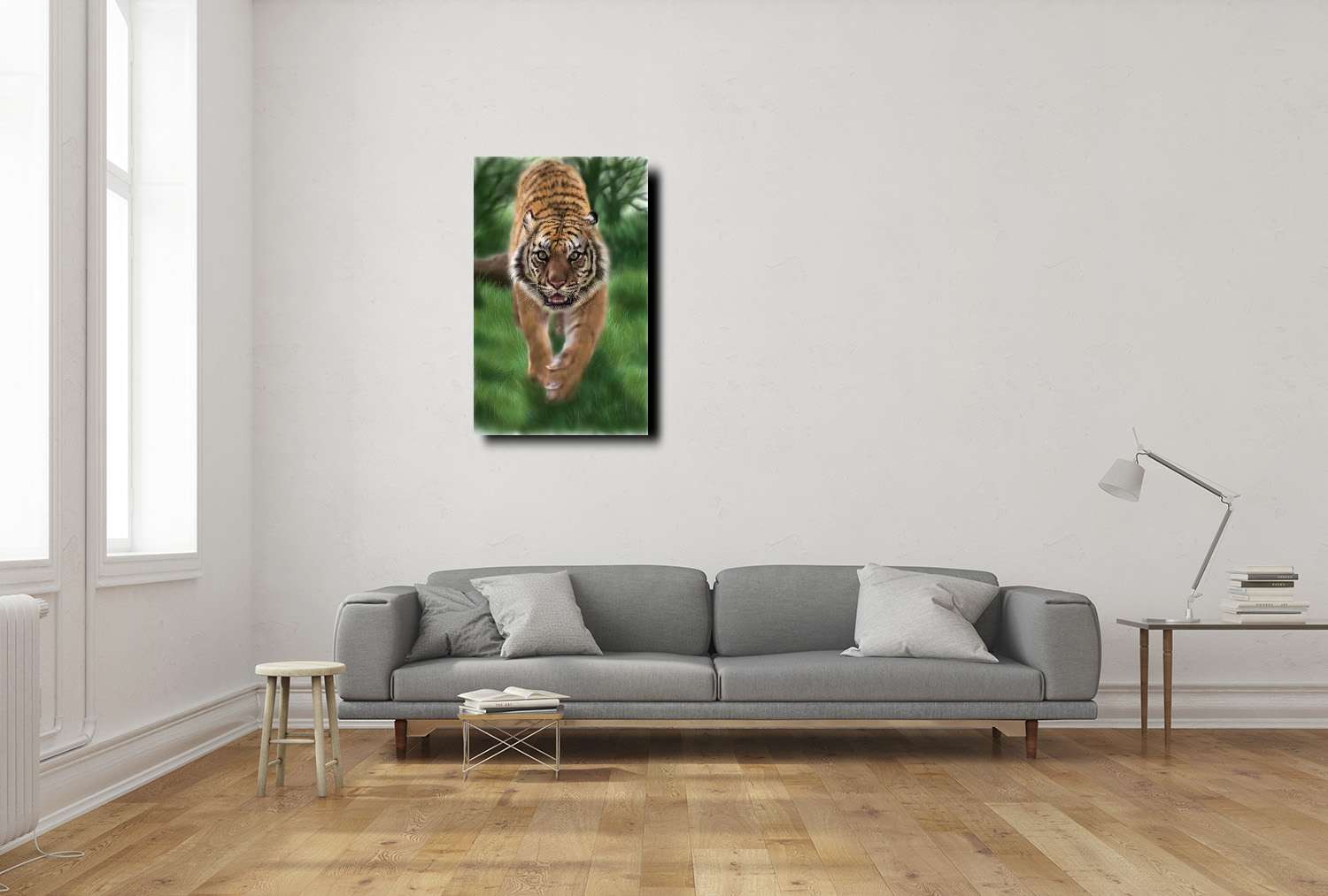 畫家運用了極為細膩的筆觸,勾勒出老虎的毛髮紋理,使其栩栩如生,每一根毛髮都顯現出野性與力量的完美結合。背景的綠色草叢與叢林微微模糊,讓猛虎的身影更加突出,強化了畫作的張力與動感。整體色調自然且充滿層次,營造出逼真的叢林氛圍,讓人彷佛身臨其境,能感受到猛虎逼近時的大地顫動與氣息逼人。