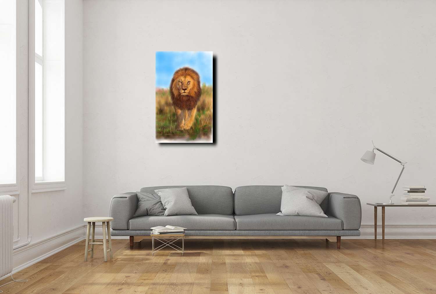 畫家運用細膩的筆觸刻畫獅子的每根鬃毛,使其呈現出層次豐富的質感,並透過精準的光影運用,使畫面更加立體生動。背景則是非洲草原的遼闊景色,溫暖的陽光映照在獅子的身上,營造出強烈的生命力與震撼力,讓人感受到大自然最純粹的力量與和諧。