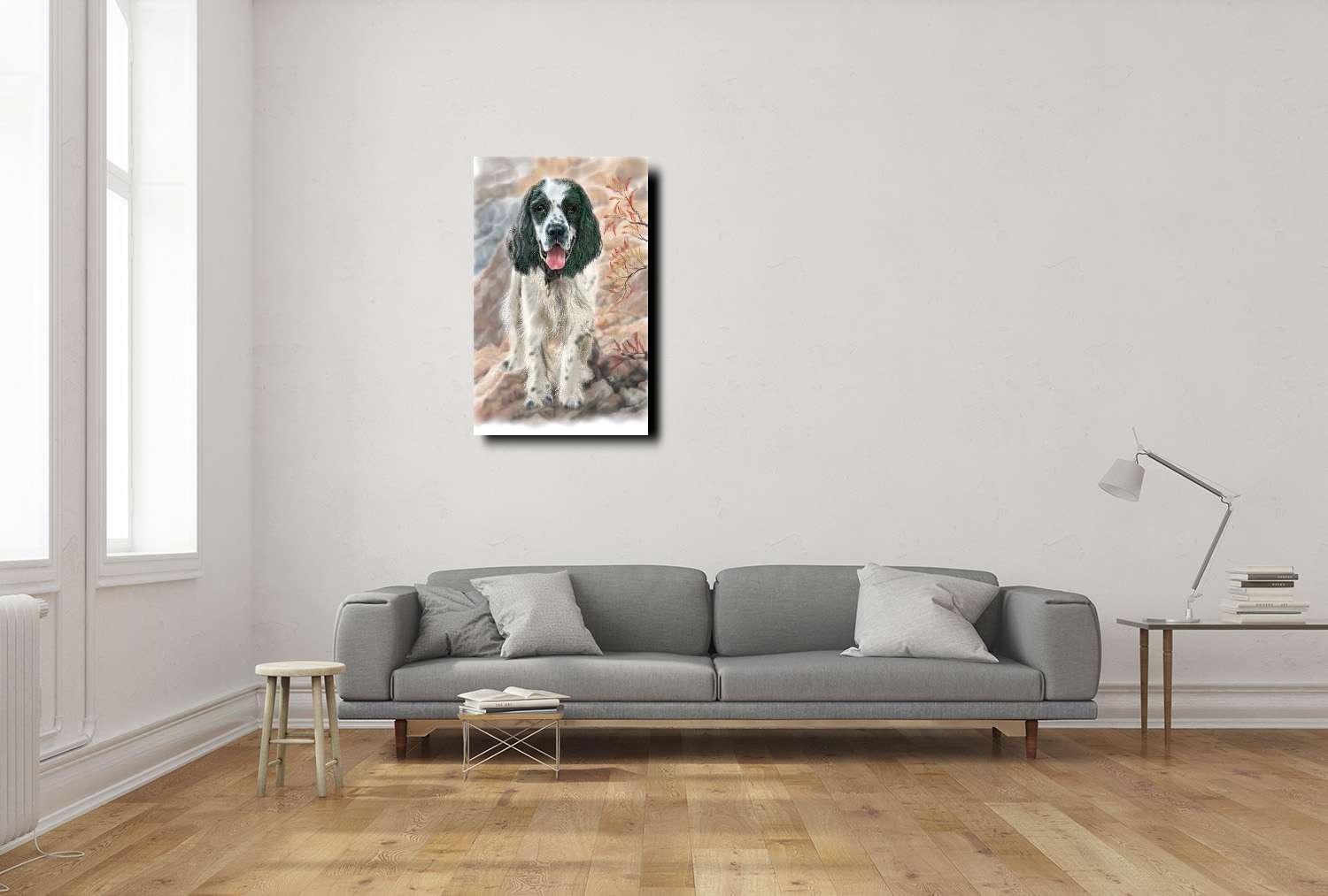 在這幅作品中,畫家以精細的筆觸刻畫出毛髮的層次感,特別是黑白相間的毛色,使整體畫面更顯生動立體。背景的秋葉與岩石相映成趣,營造出溫暖與堅毅並存的氛圍,令人彷彿能感受到這隻狗狗帶來的活力與溫暖。