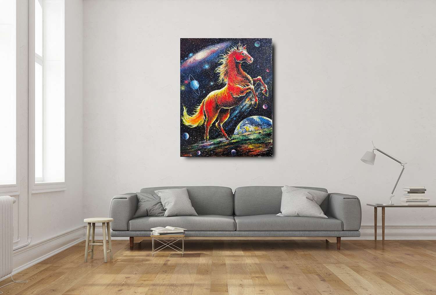 劉吉川 天馬行空 | 2026 尺寸:91x116.5 cm 50 F厚度:3.2mm 媒材:壓克力顏料,木板,麻布 創作年份:2026 暫無販售 ?藝術品購買說明 付款方式:ATM轉帳付款、信用卡線上刷卡、信用卡分期 分期數 每期金額 3期 利率0% NT$ 10,000 6期 NT$ 5,155 12期 NT$ 2,632 作品敘述 動物常作為創作者欣賞、創造的題材,所表現的動態感與吉祥的象徵,在「馬年」中別具意義。 然而藝術家劉吉川不僅創造馬,也建構馬的草原。〈天馬行空〉關聯著想像力、願望及豪放飄逸的思維,藝術家運用這個理念創造新視角。赤馬奔騰在星河上躍起,表現出生命力與健壯的肌理,也融入壯麗的行星、恆星與星系,那不是馬的起點或去處,奔馳在宇宙星塵中的天馬,象徵無限的可能性與希望。 本畫以壓克力為媒材,並細緻地塗上一層 10 號凡尼斯,以確保長期的保護與恆久的光澤。 Keywords:馬 壁畫 壓克力畫 星空畫 銀河 天王星 天馬行空 馬到成功 Subject:動物 文化 星星 Style:超現實 象徵 馬 夜色 天空 相關藝術品 view all