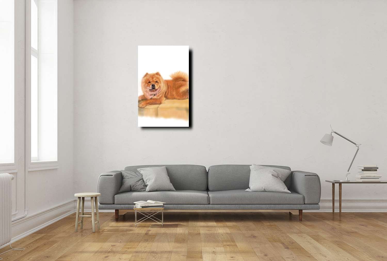 這幅畫展現了一隻慵懶而自信的鬆獅犬,悠閒地趴在石階上,露出滿足而祥和的微笑。大師以溫暖的金棕色調描繪出鬆獅犬濃密的毛髮,使其在陽光的映照下顯得更加柔和且高貴。背景的暖色調石階與輕柔的光影交錯,營造出寧靜與尊貴並存的氛圍,讓整幅畫充滿了溫暖的氣息。鬆獅犬以穩重、獨立且忠誠著稱,它們天生帶有一種貴族般的氣質,而這幅畫正是對這種性格的完美詮釋。畫中的鬆獅犬姿態悠閒,但牠的眼神透露出機警與智慧,象徵著優雅的從容與穩定的力量。這不僅是一幅狗狗的畫像,更是一種生活態度的展現懂得享受當下,沉穩自信,靜靜感受世界的美好。