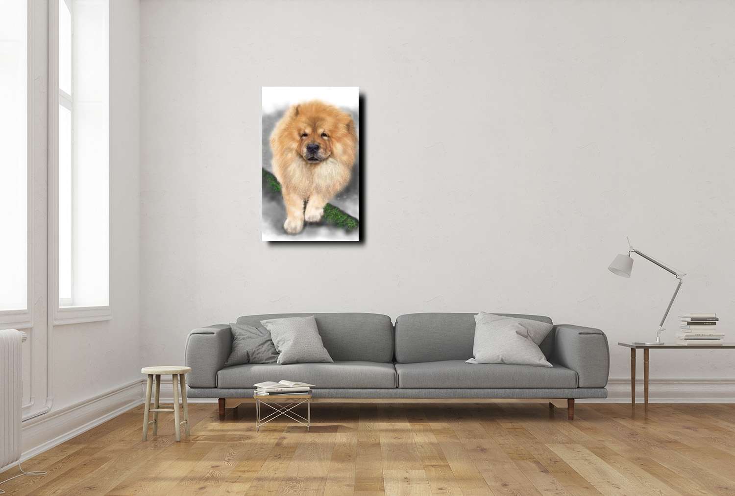 是一幅極具氣勢與尊貴感的作品,描繪了一隻步伐穩健、自信昂揚的鬆獅犬。牠那蓬鬆濃密的金色毛髮,如同一襲貴族般的華麗披風,散發出與生俱來的威嚴與高貴氣質。畫中的鬆獅犬步履堅定,目光深邃而從容,彷彿象徵著領袖般的風範與無懼的精神。巧妙運用細緻的筆觸來呈現毛髮的層次感,並以柔和的光影技巧,營造出立體而自然的質感,使畫面既富有寫實感,又帶有藝術的獨特韻味。背景色調簡約柔和,讓觀者的視線自然聚焦在這頭充滿氣場的鬆獅犬身上,進一步強調牠的王者風範。這幅畫作無論擺放在客廳、辦公室、書房或私人收藏空間,都能瞬間提升環境的格調與氛圍。