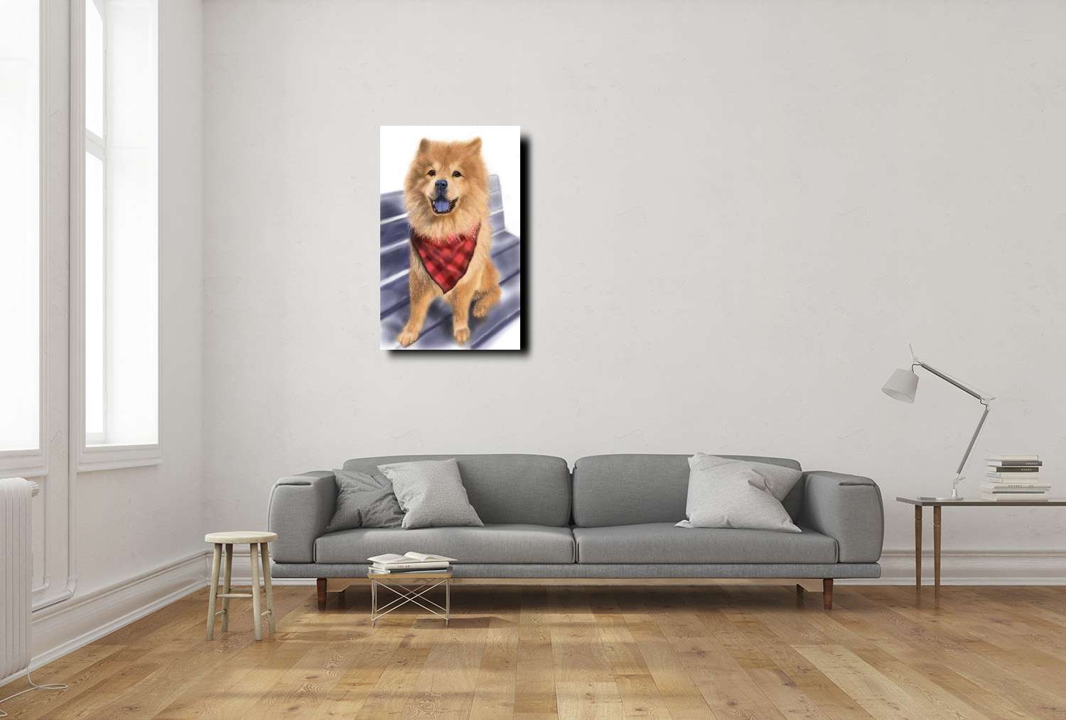 一幅充滿活力與溫暖的畫作,描繪了一隻開朗自信的鬆獅犬,牠坐在長椅上,露出燦爛的笑容,彷彿正與您分享屬於牠的幸福時光。牠脖子上繫著一條鮮紅色的格紋方巾,更增添了一種俏皮與親和感,使整幅畫作既有高貴的氣質,又散發著輕鬆愉悅的氛圍。以細膩的筆觸描繪出鬆獅犬柔順豐厚的毛髮,使畫面充滿層次感與真實感。背景的長椅設計低調簡約,既突出了主角,又營造了一種生活感,使畫作充滿故事性,彷彿這隻快樂的狗狗正在等待主人一起度過一個美好的午後。