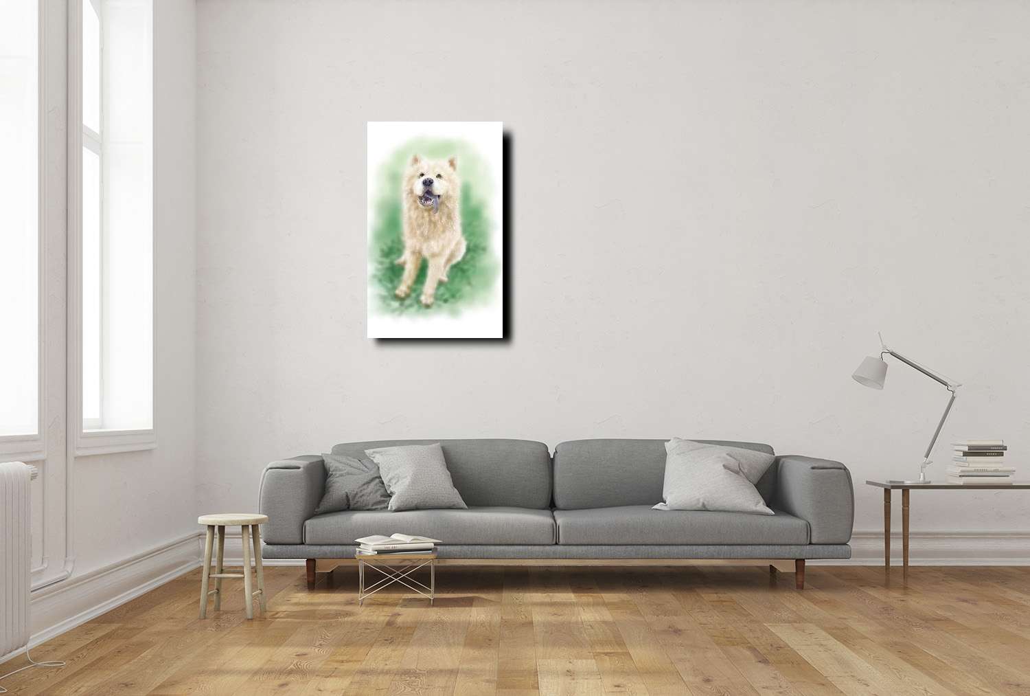 這幅畫中的米白色鬆獅犬,帶著開朗的微笑與標誌性的紫色舌頭,坐在柔和的綠色背景之中,整體畫面散發出輕快、愉悅、自在與自然融合的氛圍。狗狗的嘴巴微微開啟,舌頭自然垂下,這種表情通常出現在狗狗感到開心與放鬆的時刻,展現出最純真的快樂。眼神明亮而輕鬆,沒有過多的緊張感,而是透露出愉悅的期待與興奮,彷彿正享受戶外的微風與陽光。畫面的筆觸輕盈,使狗狗的毛髮顯得柔軟而輕快,搭配背景的水彩暈染效果,營造出一種放鬆與自由的感覺。狗狗的輪廓與背景自然融合,沒有生硬的邊界感,讓整體畫面更具流動性。畫面呈現出一種微風輕拂的舒適感。